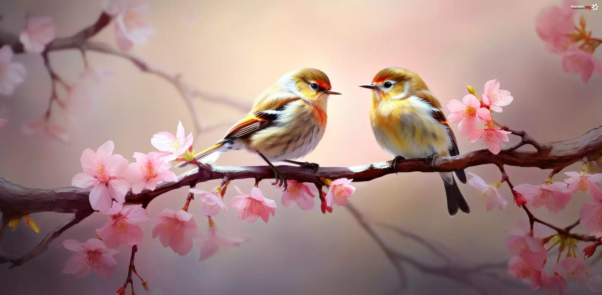 Ptaki, Kolorowe, Gałązka, Różowe, Kwiaty, Grafika - Zdjęcia