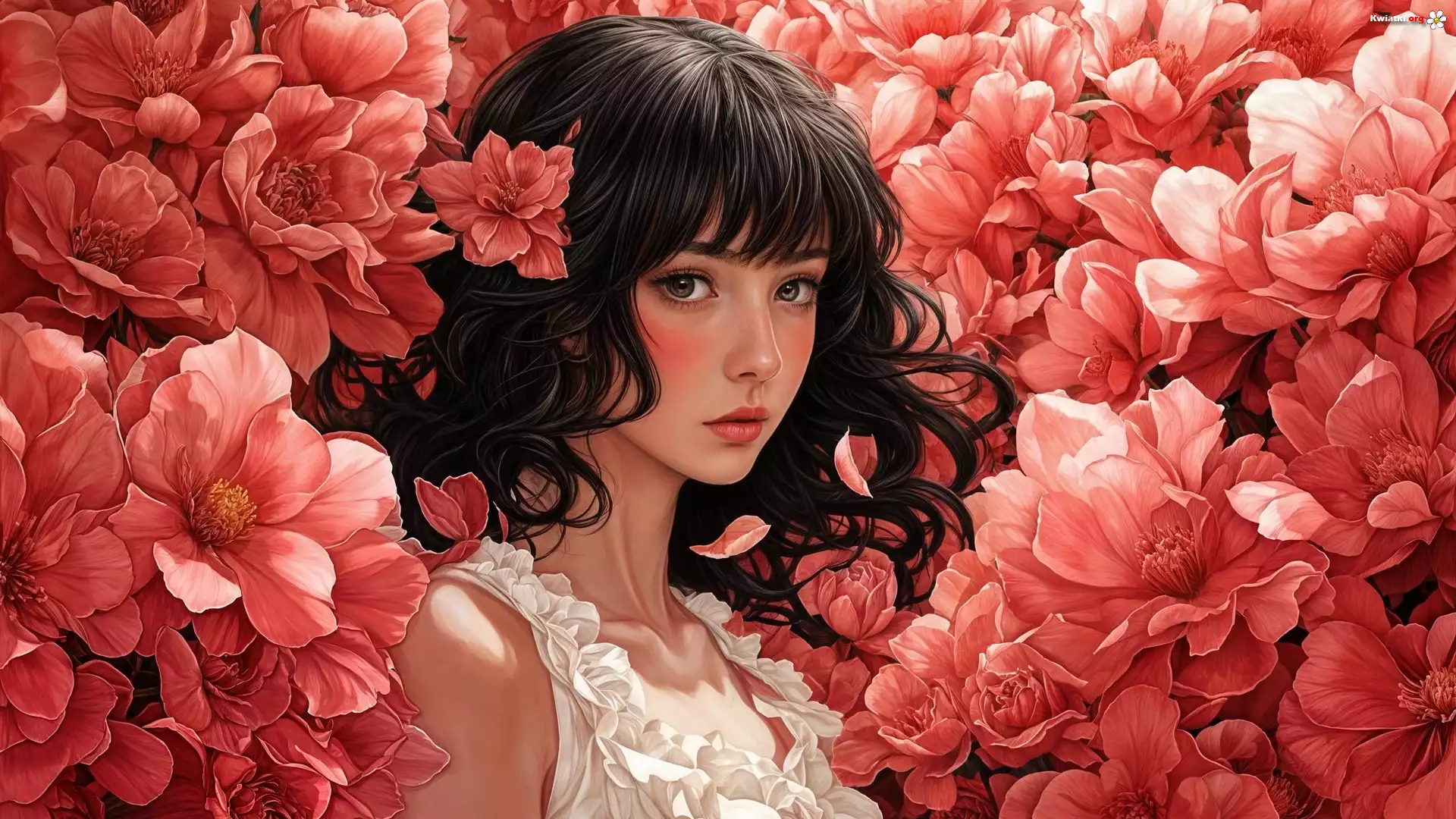 Dziewczyna, Ciemne, Włosy, Różowe, Kwiaty, Grafika - Zdjęcia