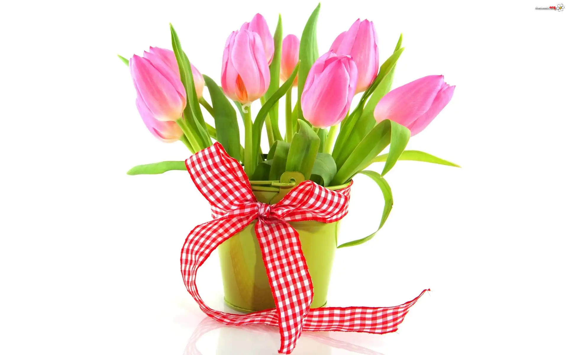 Różowe, Tulipany, Wiaderko, Kokarda, Kratka - Zdjęcia