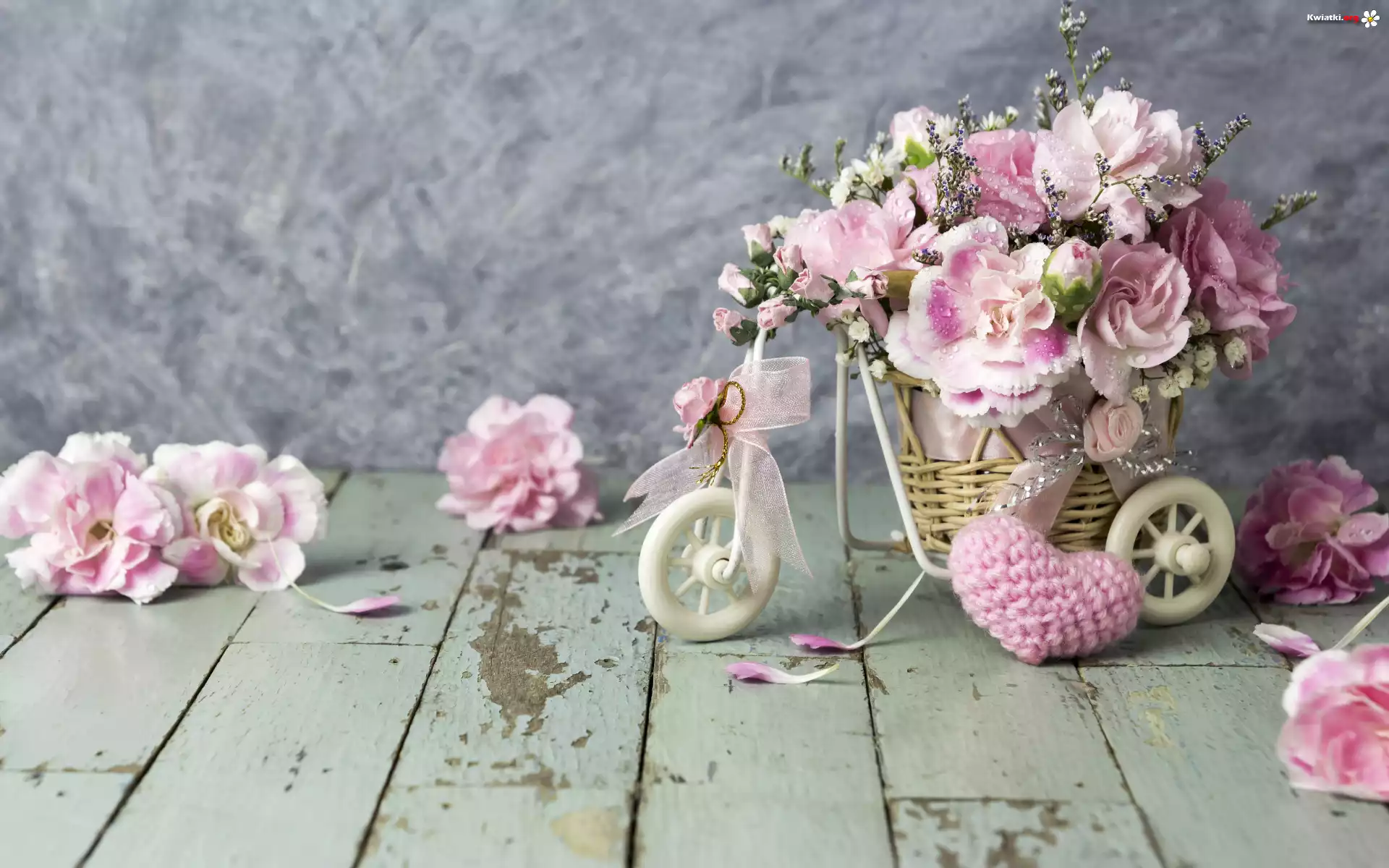 Kompozycja, Różowe, Kwiaty, Goździki szabo, Rowerek, Serce - Zdjęcia