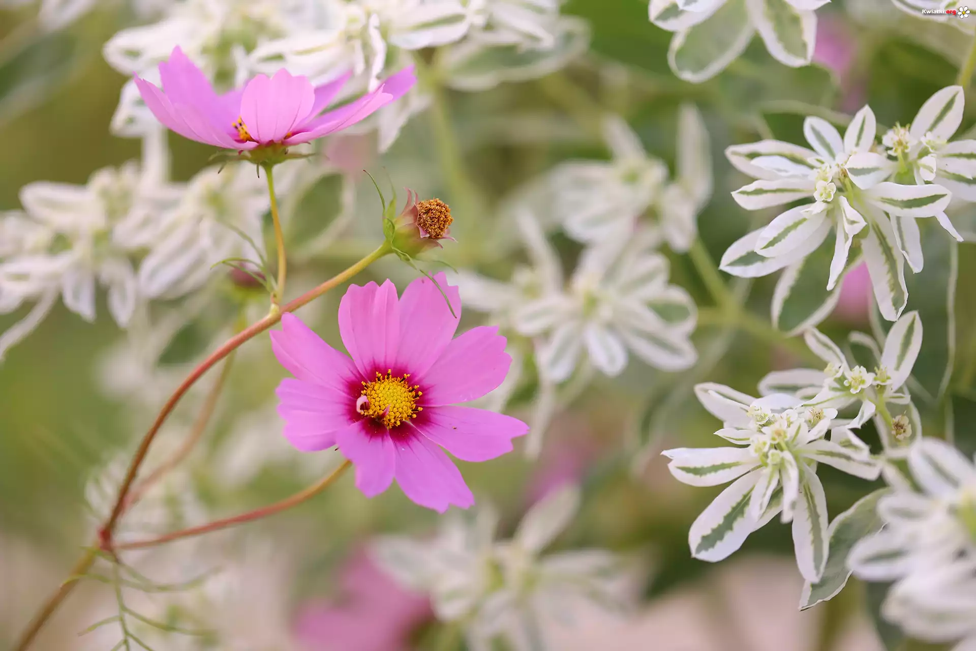 Kosmea, Różowe, Kwiaty, Wilczomlecz białobrzegi - Zdjęcia