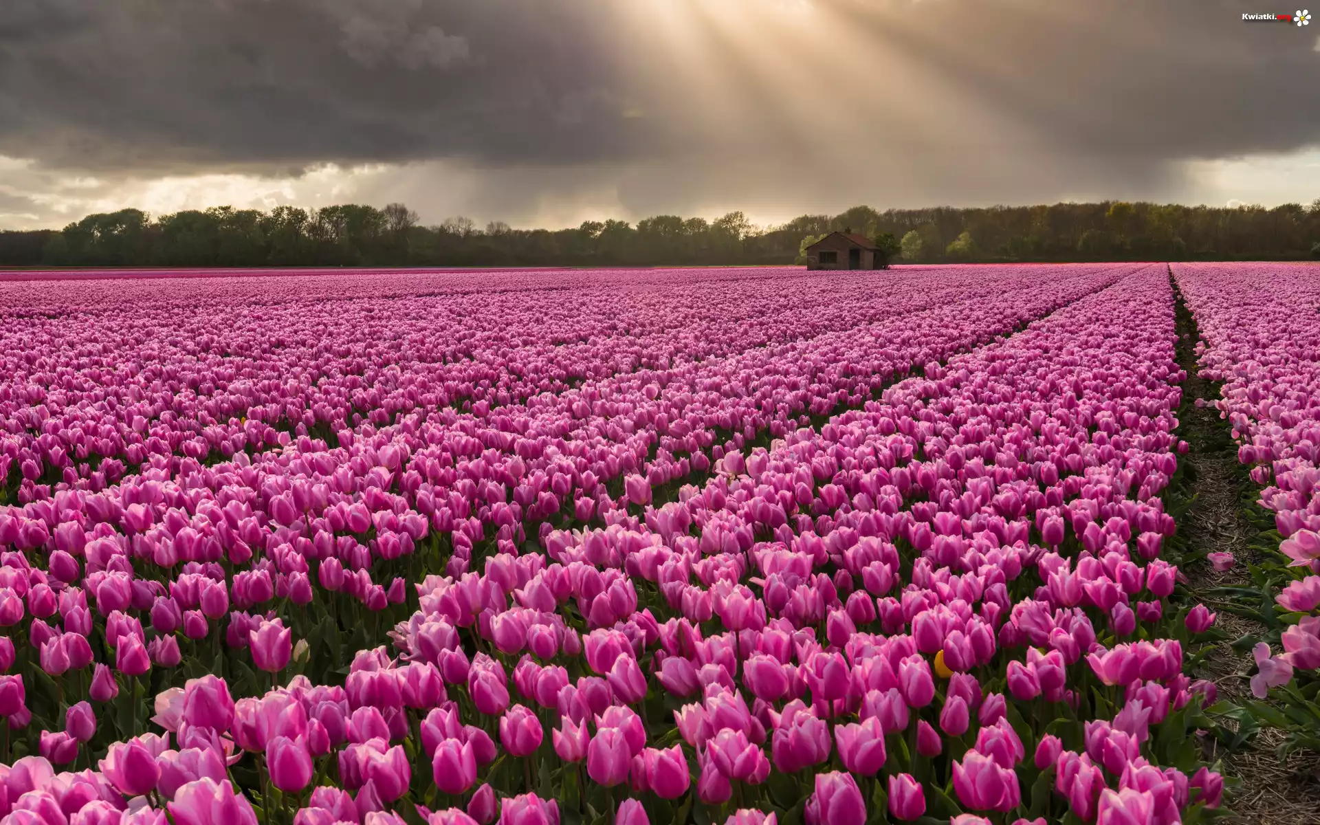 Kwiaty, Różowe, Tulipany, Plantacja, Drewniana, Szopa, Drzewa - Zdjęcia