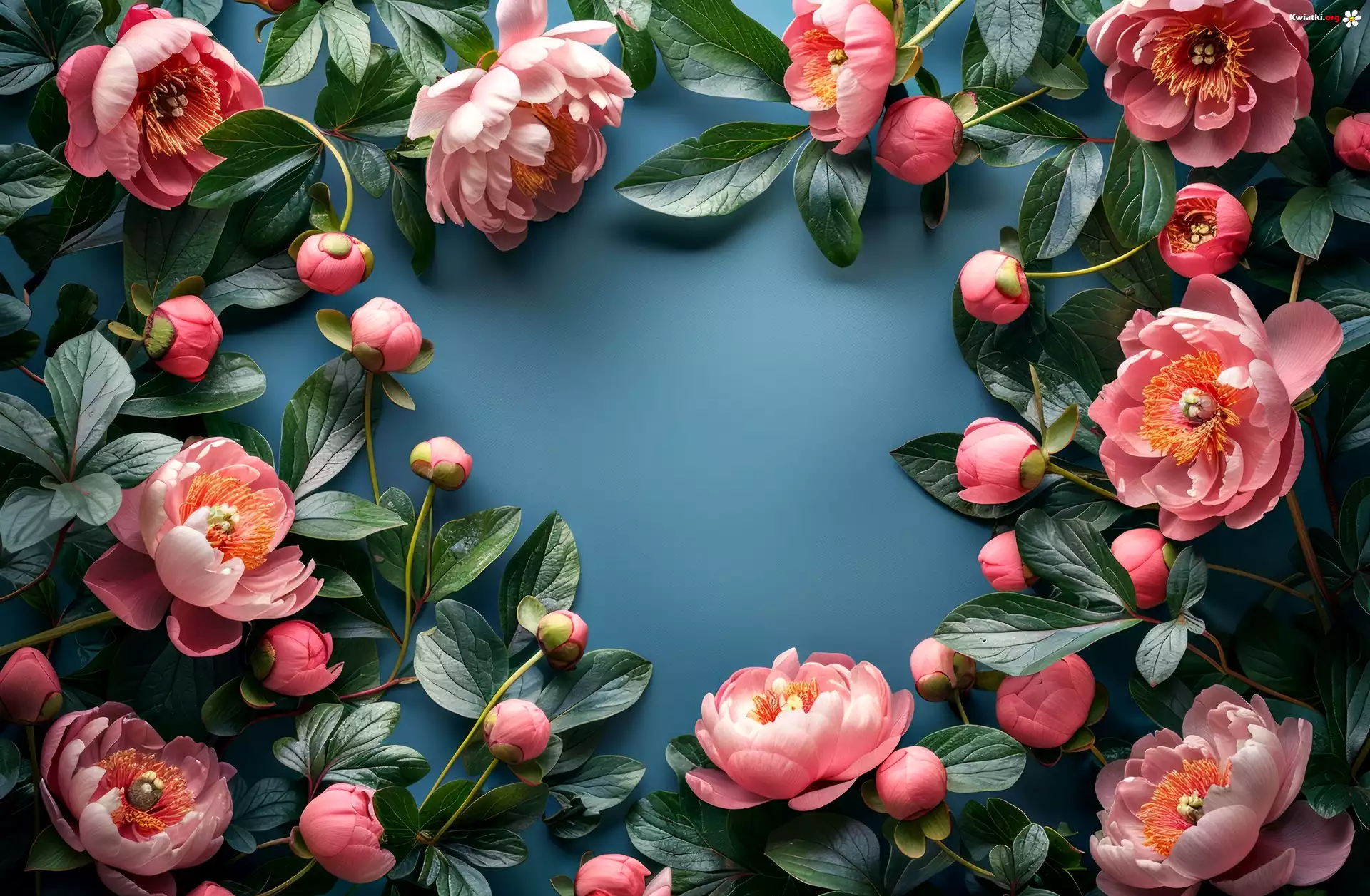 Piwonie, Różowe, Kwiaty, Liście, Grafika - Zdjęcia