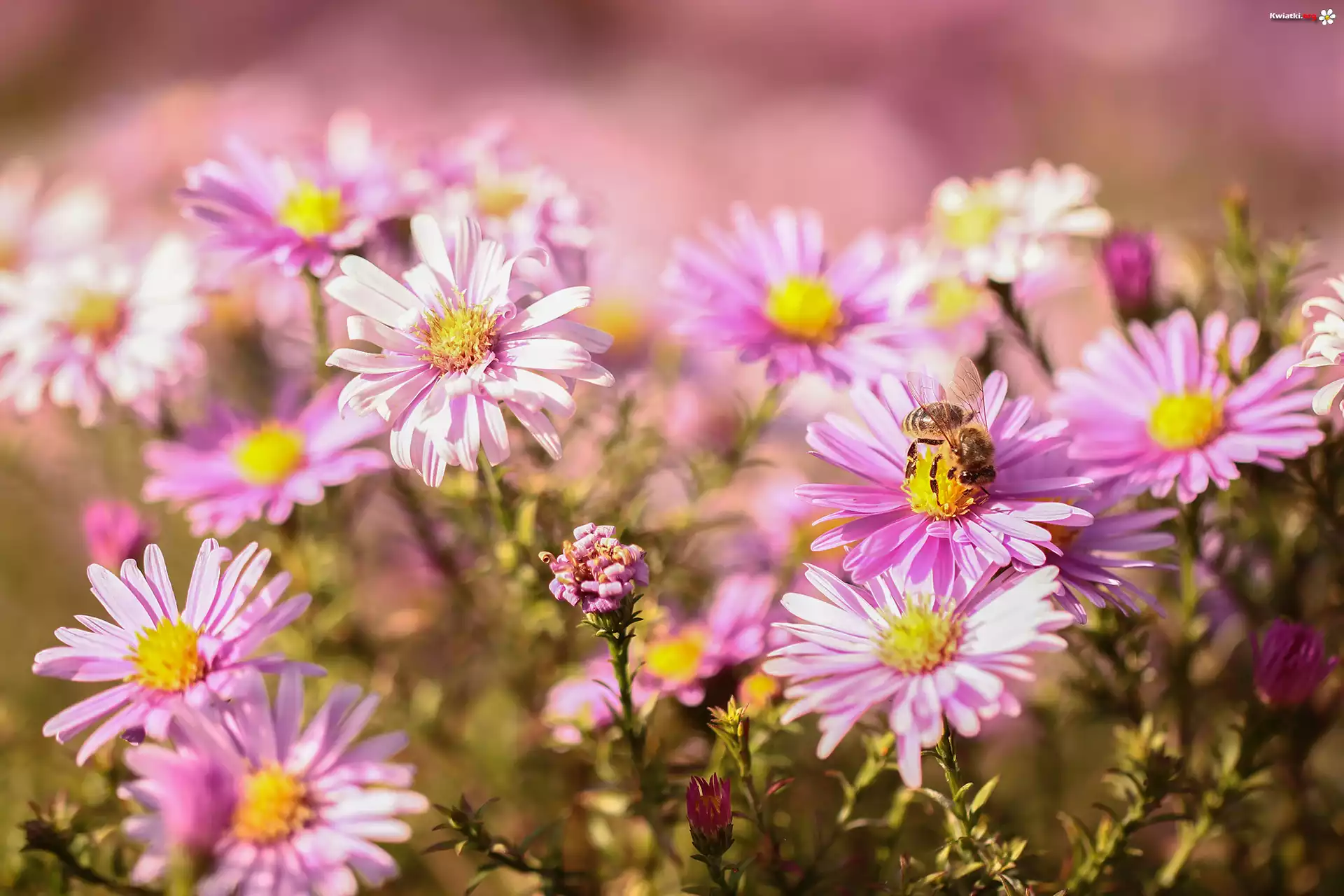 Różowe, Astry marcinki, Krzaczaste, Kwiaty, Pszczoła - Zdjęcia