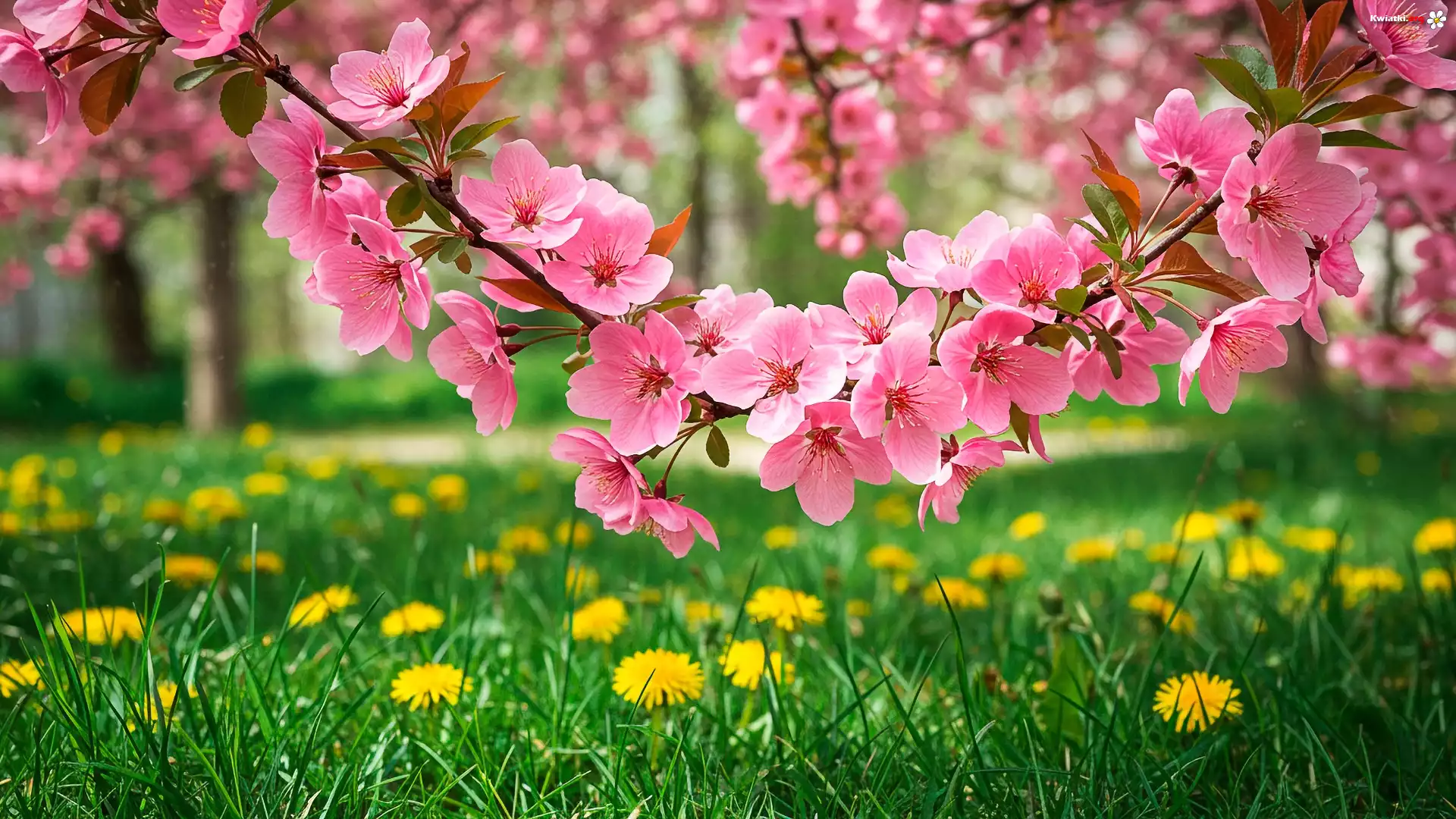 Łąka, Kwiaty, Mniszek pospolity. Drzewo owocowe, Kwiaty, Różowe - Zdjęcia