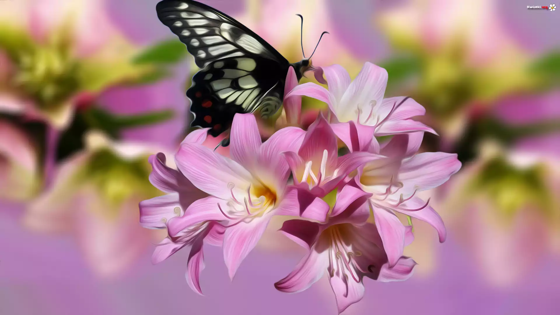 Różowe, Kwiaty, Motyl, Grafika - Zdjęcia