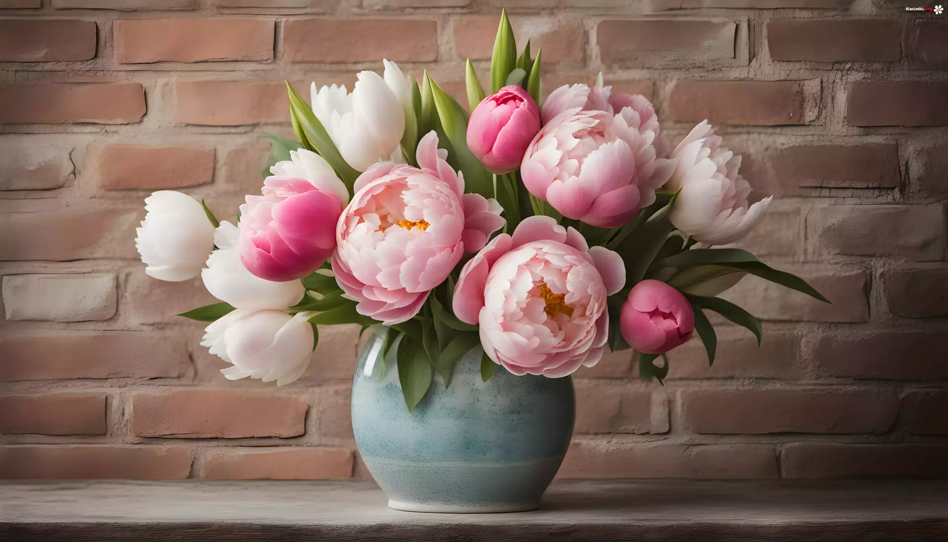 Kwiat Kwiaty, Piwonie, Białe, Różowe, Wazon, Mur