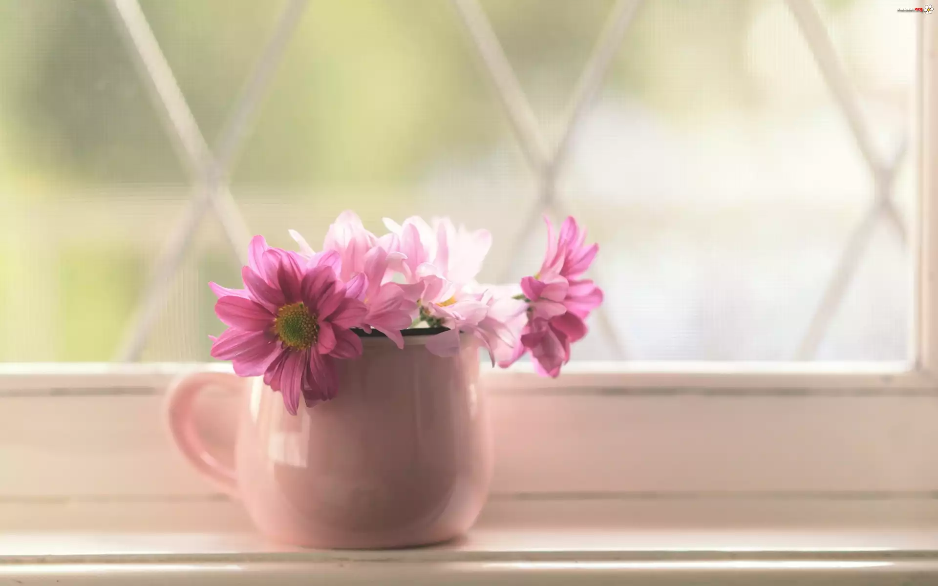Różowe, Kwiaty, Parapet, Wazonik - Zdjęcia