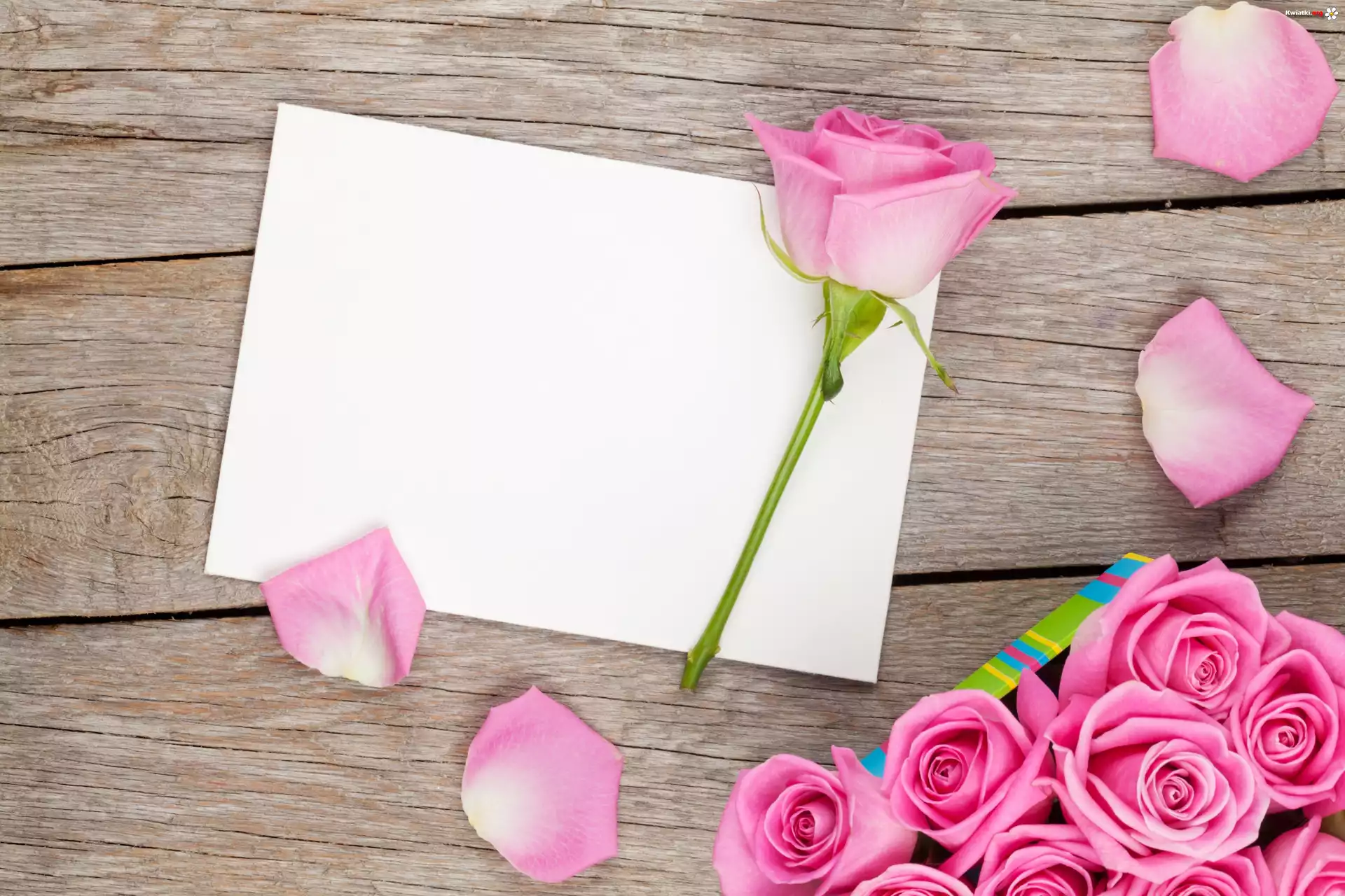 Różowe, Róże, Płatki, Kartka - Zdjęcia