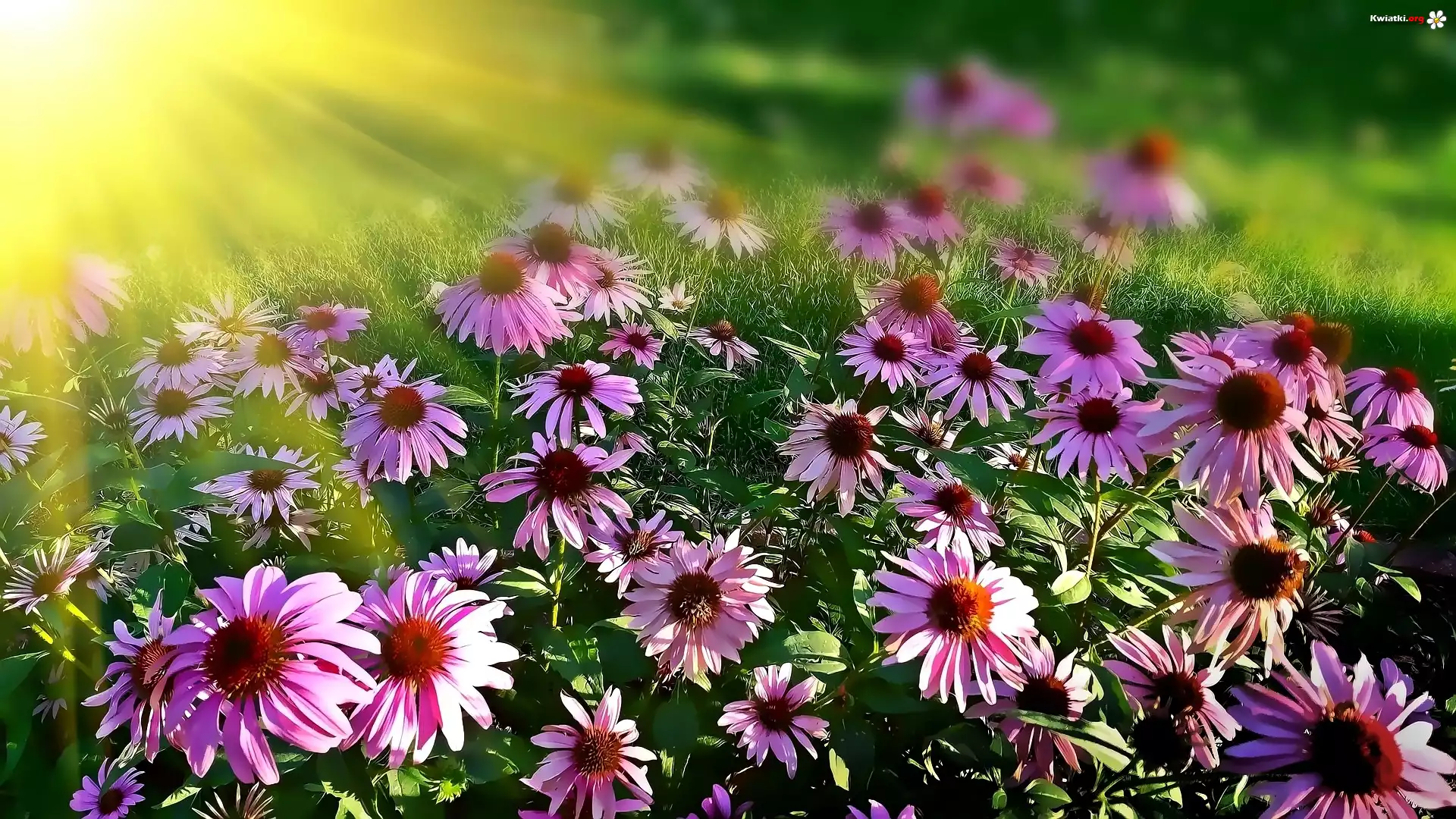 Różowe, Kwiaty. Jeżówka, Promienie, Słońca - Zdjęcia