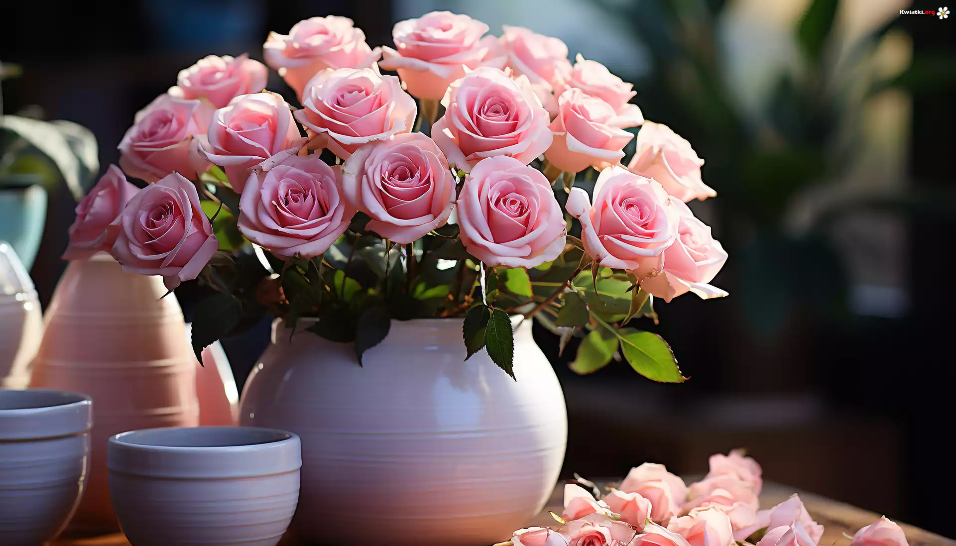 Bukiet, Różowe, Róże, Wazon, Doniczki - Zdjęcia