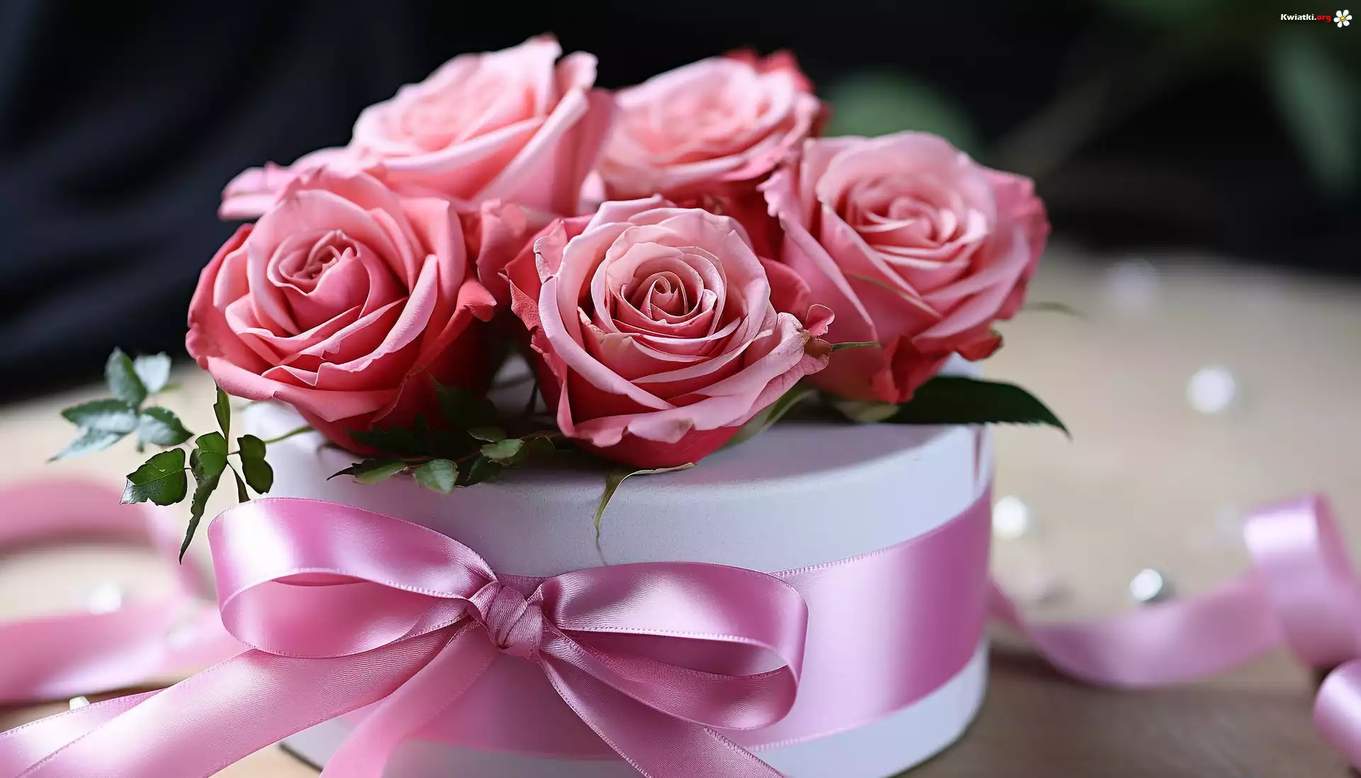 Kwiat Bukiet, Różowe, Róże, Pudełko, Kokarda