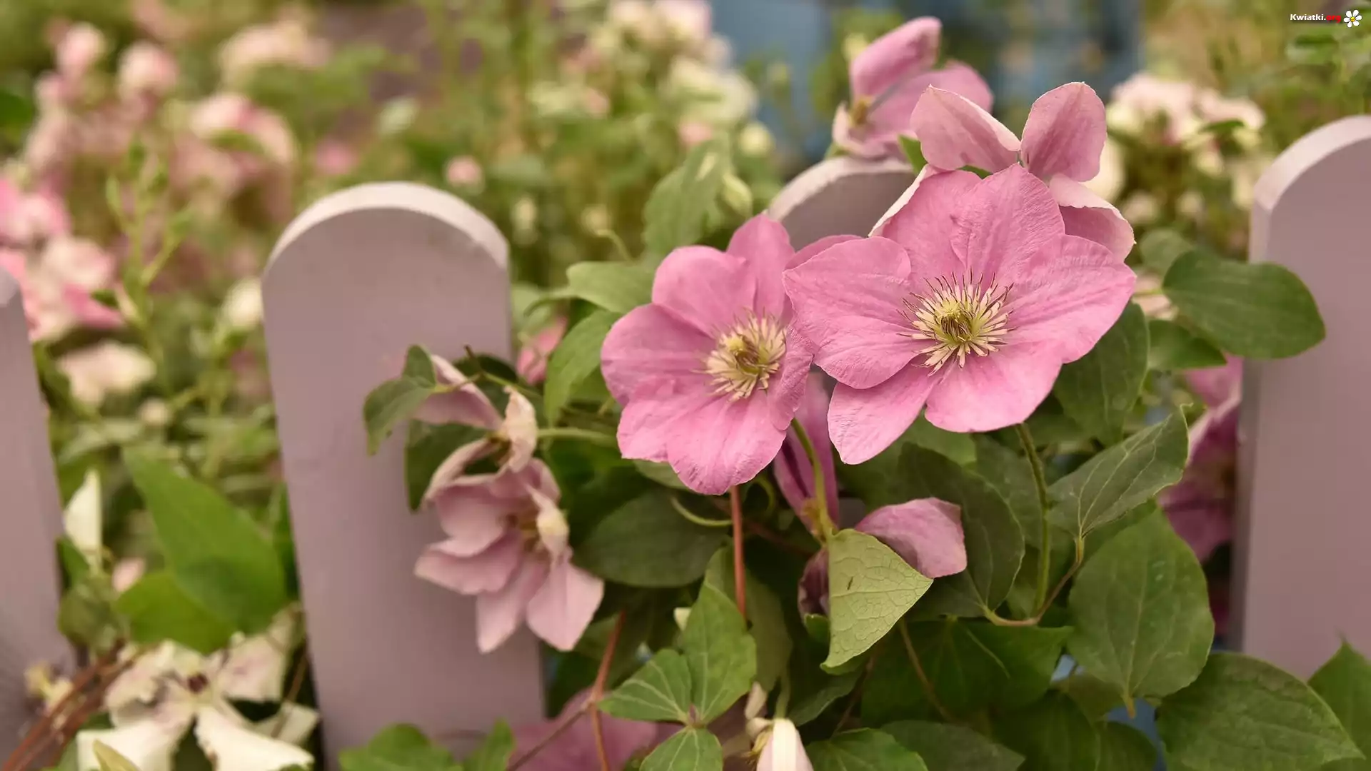 Różowe, Kwiaty, Clematis, Płotek, Rozmyte, Tło - Zdjęcia