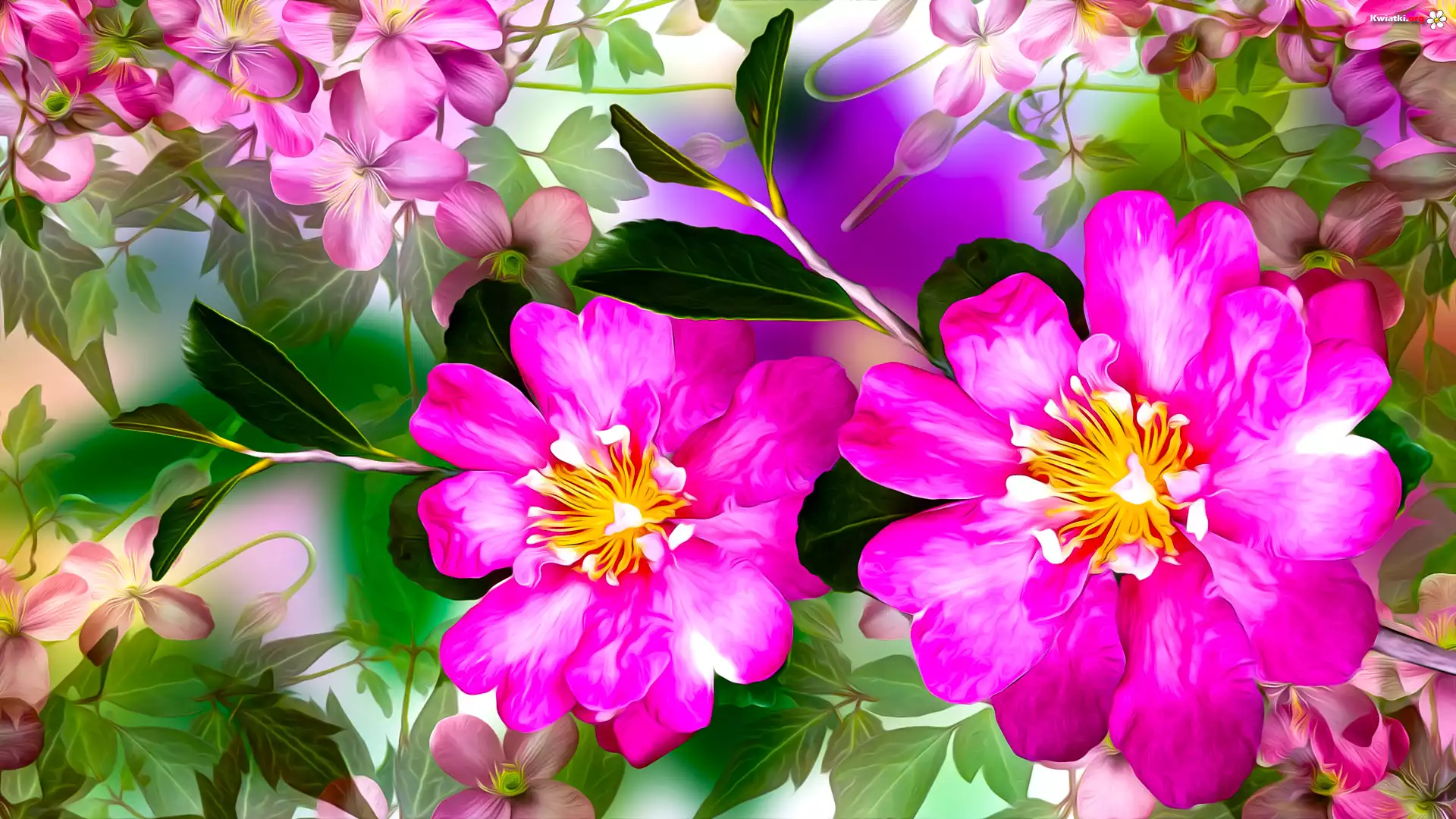 Różowe, Kwiaty, Liście, Kolorowe tło, Grafika - Zdjęcia
