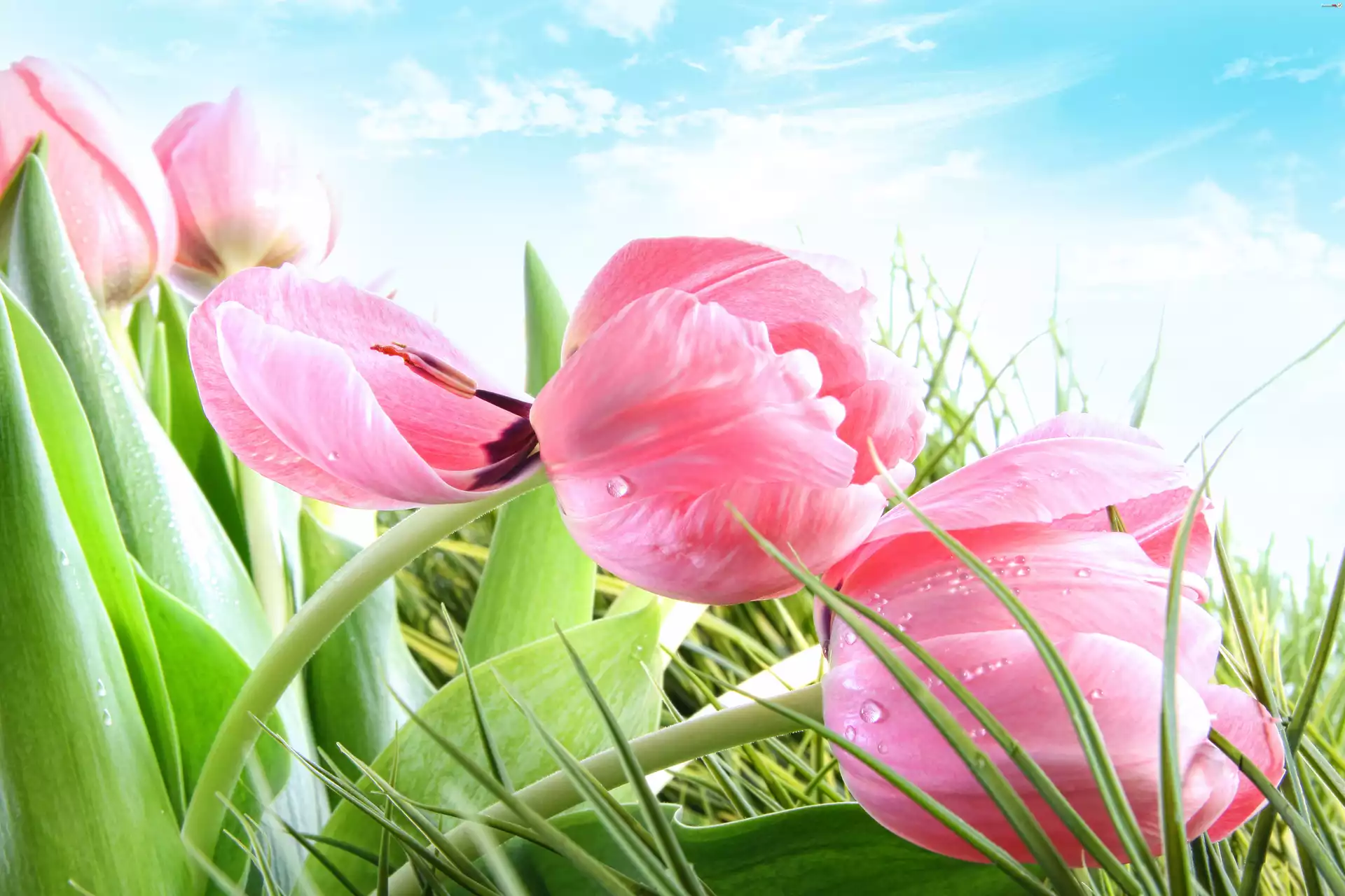 Trawa, Różowe, Tulipany - Zdjęcia