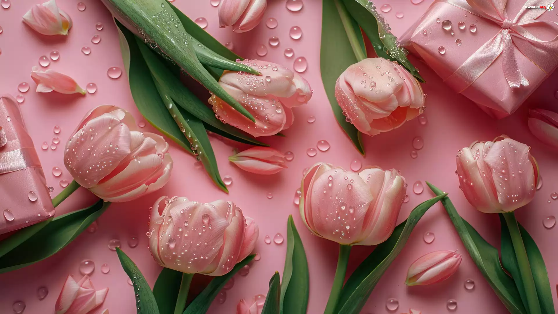 Kwiat Kwiaty, Różowe, Tulipany, Krople, Prezent