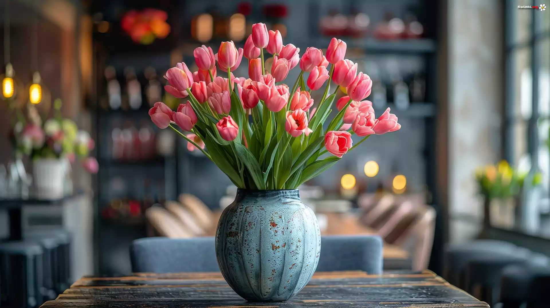 Kwiat Bukiet, Różowe, Tulipany, Niebieski, Wazon