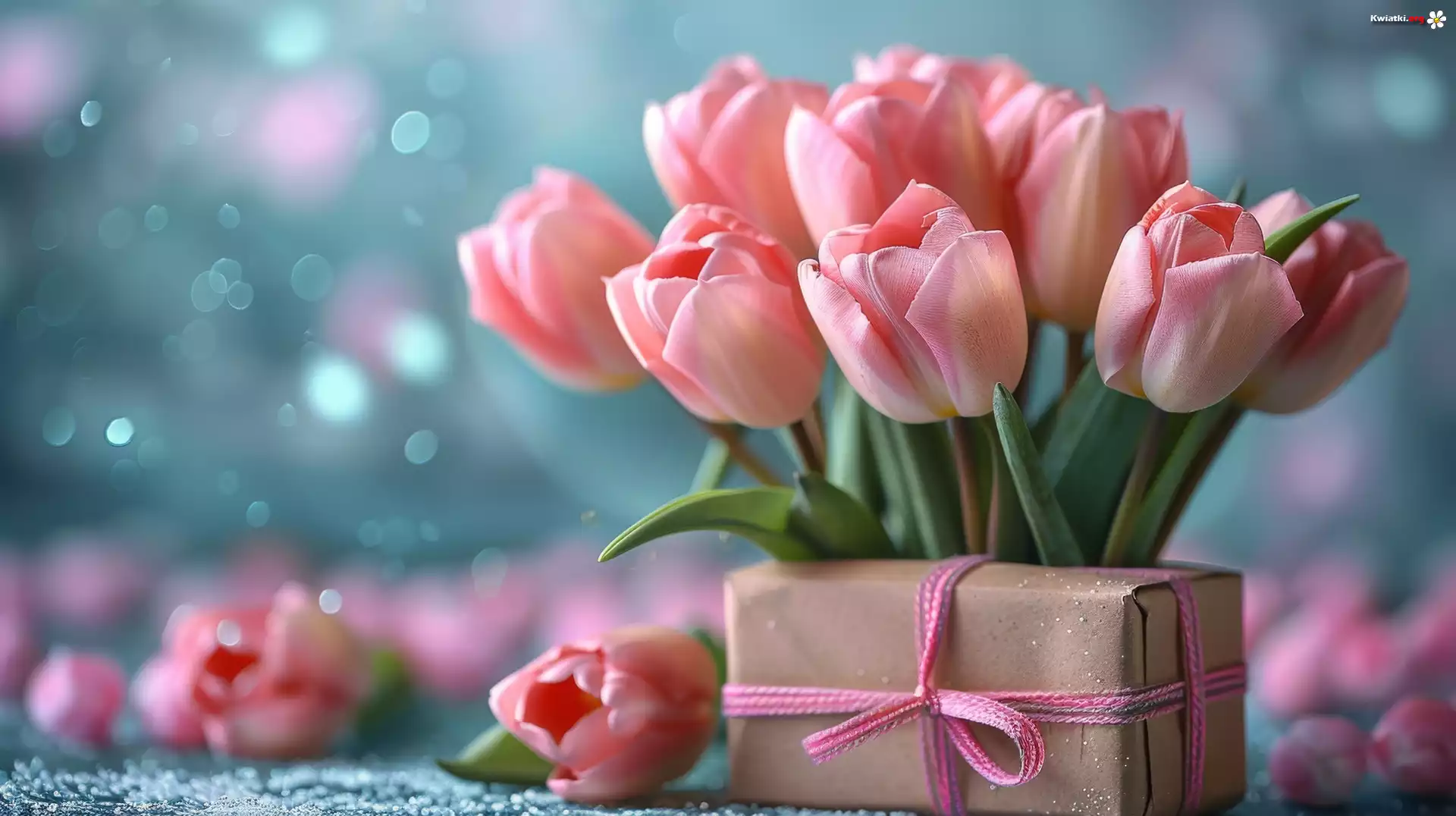 Kwiat Kwiaty, Różowe, Tulipany, Prezent, Wstążka