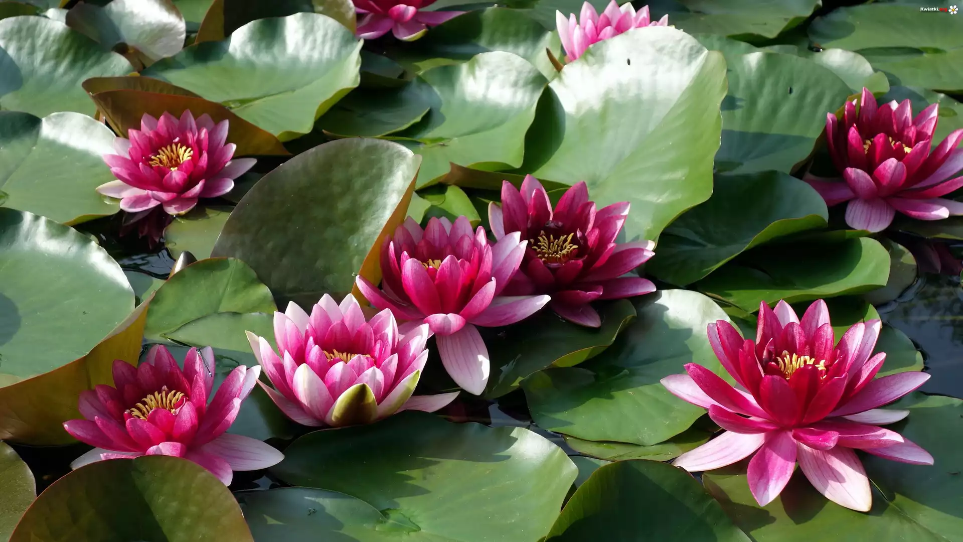 Kwiat Różowe, Kwiaty, Lilie wodne, Liście