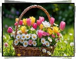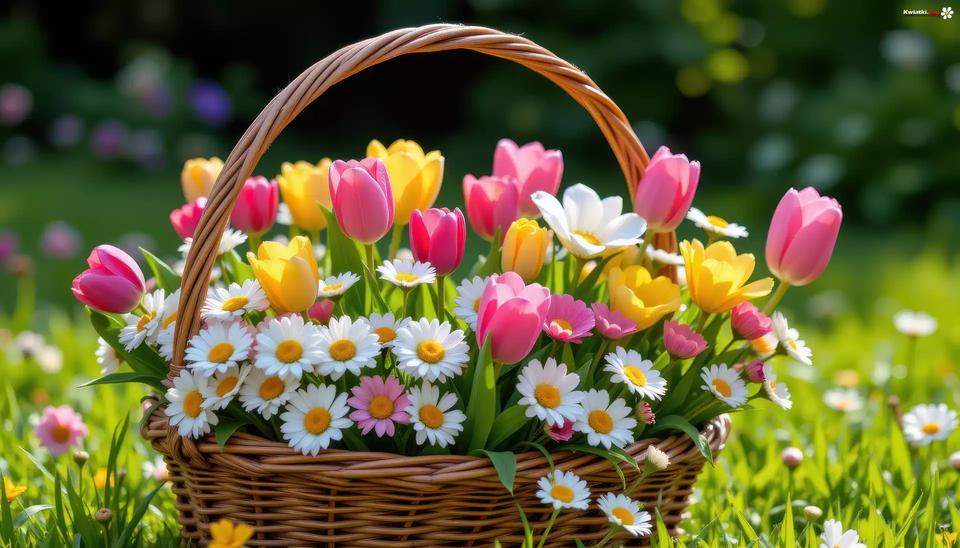 Kwiaty, Stokrotki, Żółte, Różowe, Tulipany, Bukiet, Koszyk - Zdjęcia