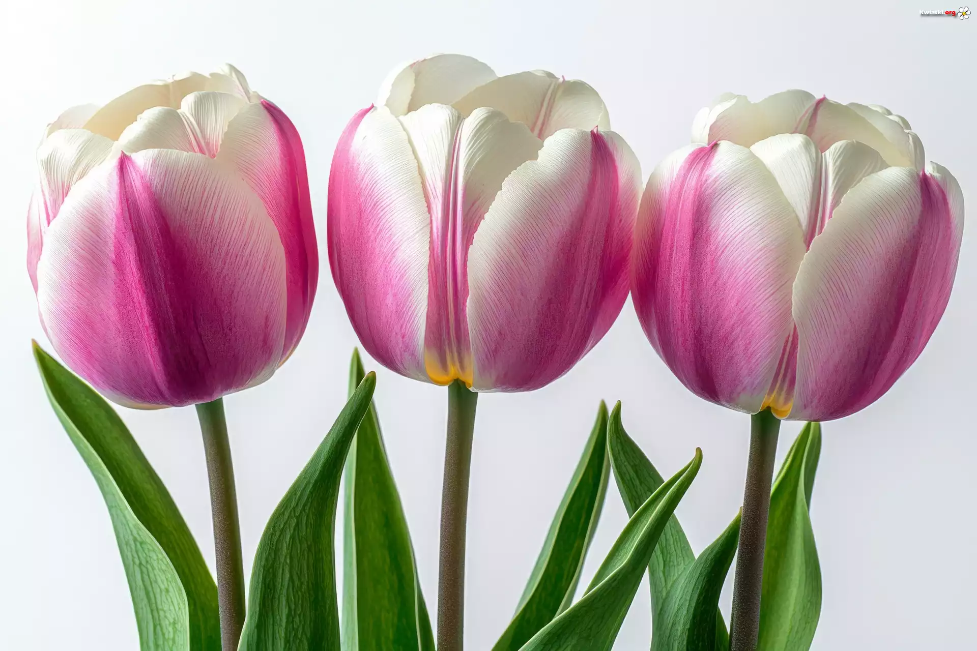 Trzy, Różowo-białe, Tulipany, Listki - Zdjęcia