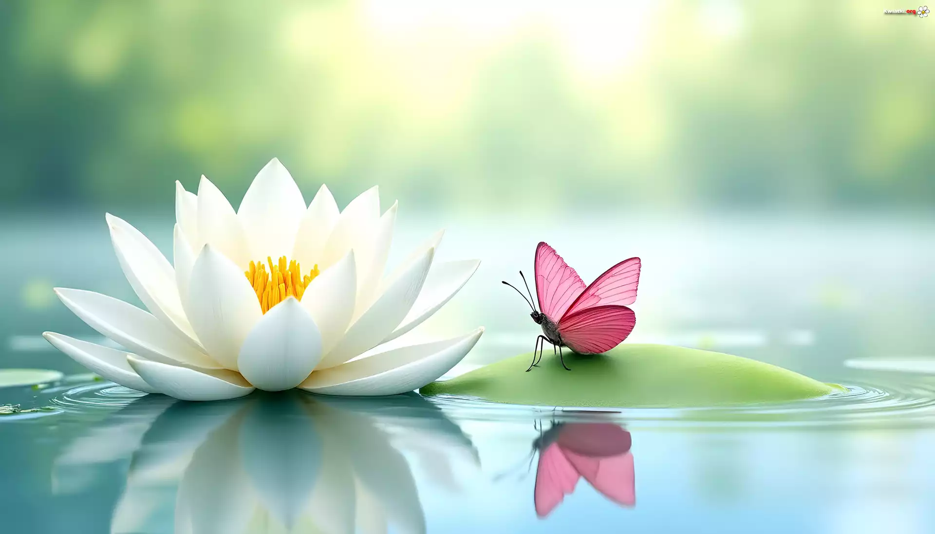 Biała, Lilia wodna, Różowy, Motyl, Grafika - Zdjęcia