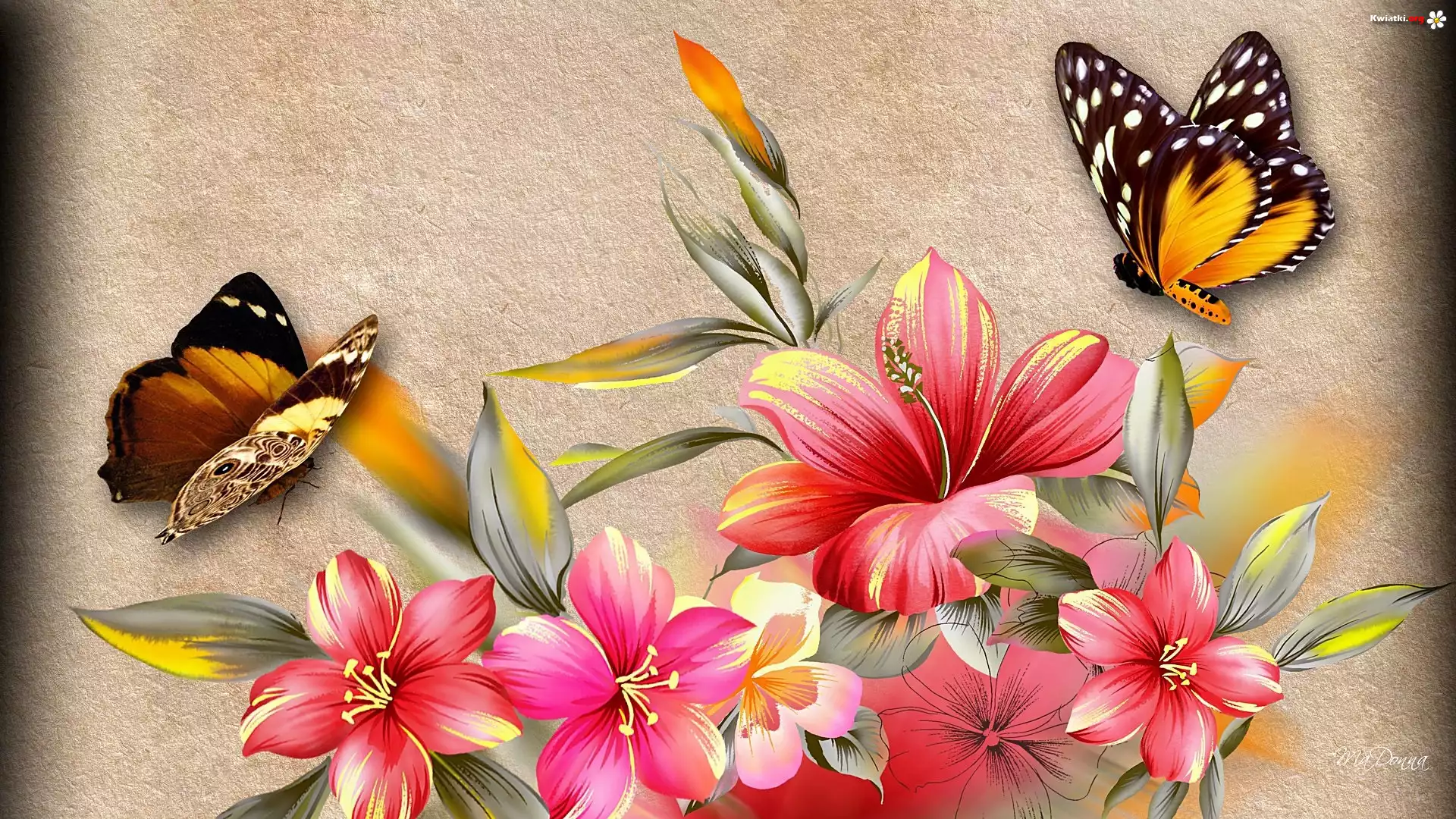Kwiat Różowy, Hibiskus, Motyle, Art