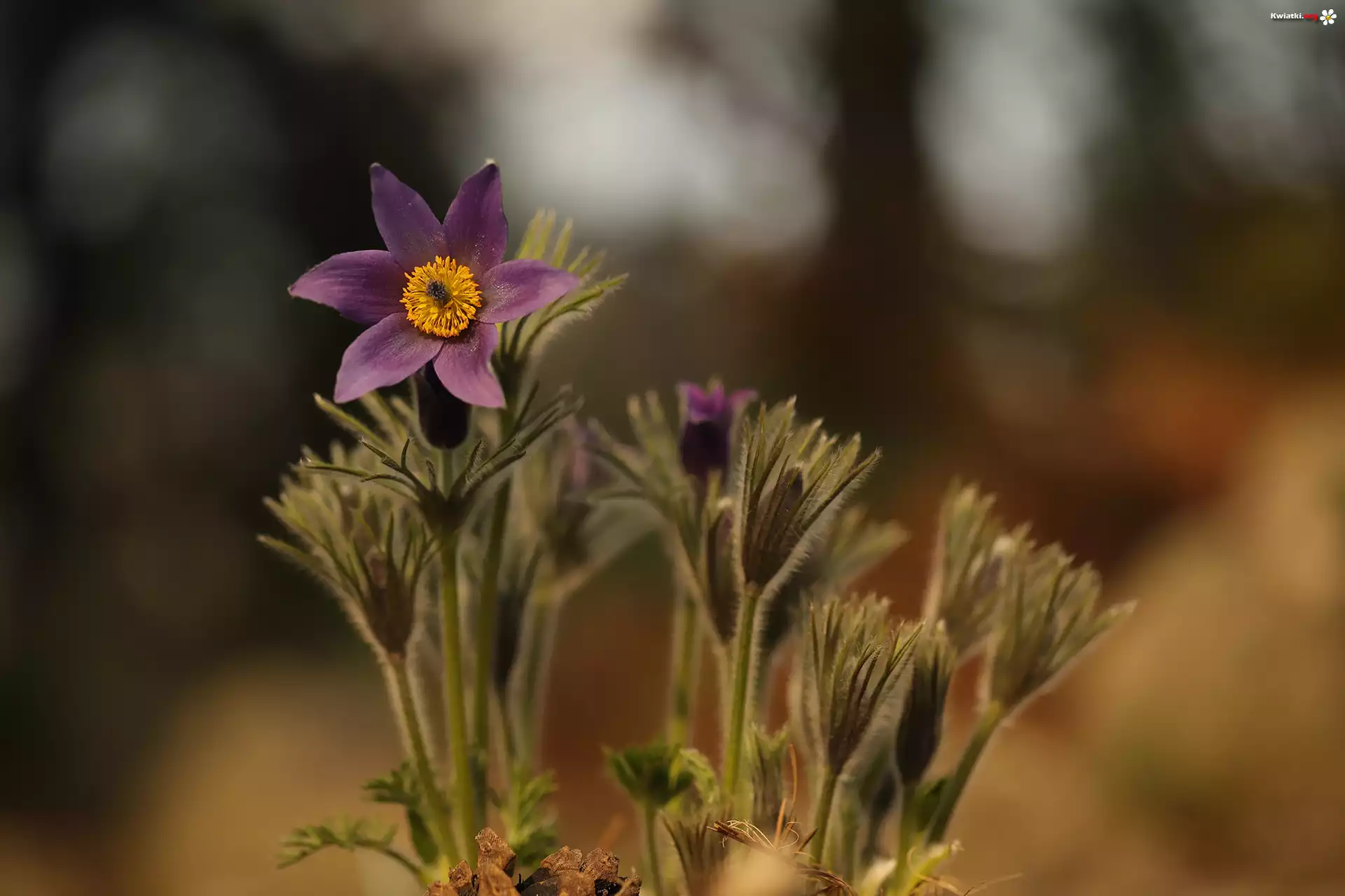 Kwiat Rozwinięta, Sasanka, Fioletowy, Kwiat, Pąki