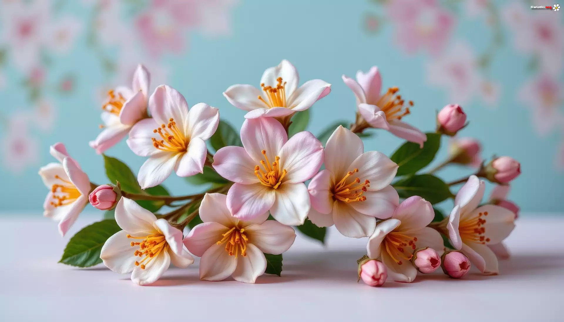Gałązka, Kolorowych, Kwiatków Forsycja Niebieskie, Niezapominajki Łąka, Kwiatuszki Kwiaty, Drzewo, Owocowe Kalia Kwitnąca, Wiśnia Kwiat Achimenes Kwiatki, Dzwonki, Grafika