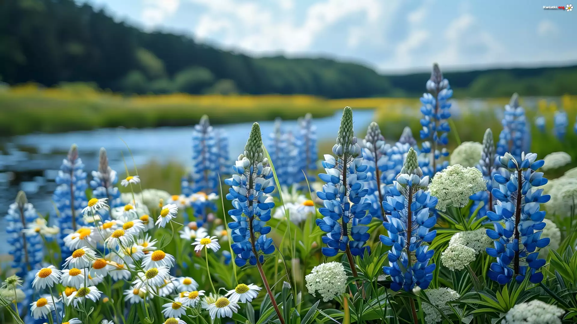 Kwiat Łąka, Kwiaty, Łubin, Rumianek, Rzeka, Grafika