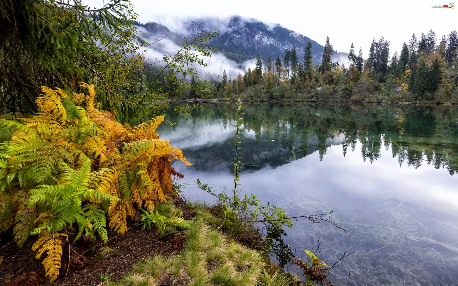 Kwiat Rzeka, Góry, Mgła, Drzewa, Paprocie
