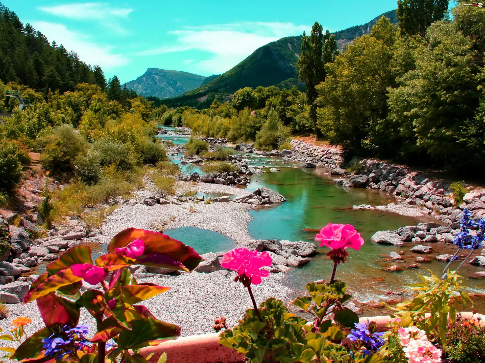 Rzeka, Góry, Las, Kwiatki - Zdjęcia