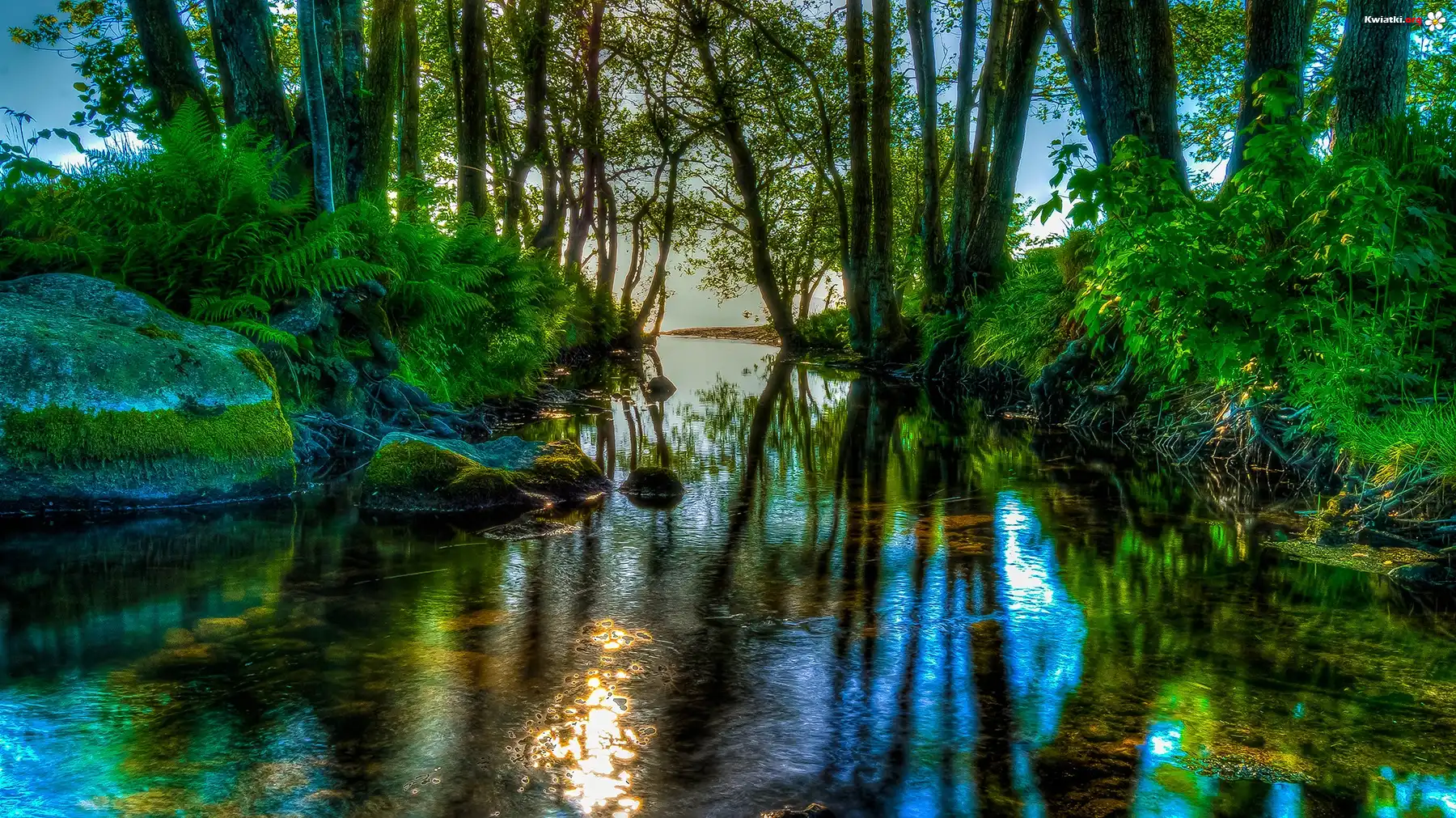 Kwiat Rzeka, Kamienie, Paprocie, Drzewa