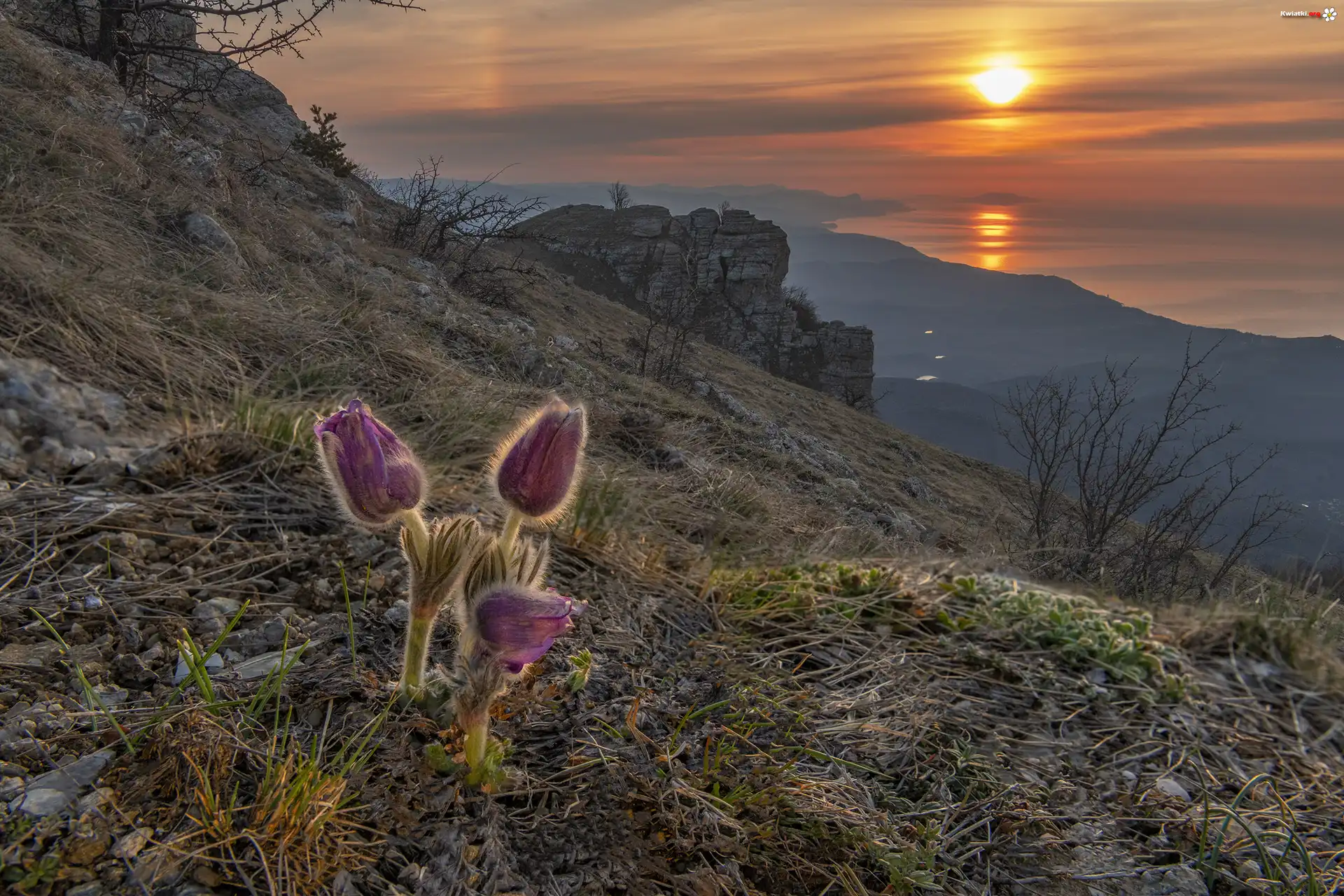 Góry Krymskie, Skały, Polana, Kwiaty, Sasanki, Masyw Demerdżi, Morze, Zachód słońca, Ukraina - Zdjęcia |