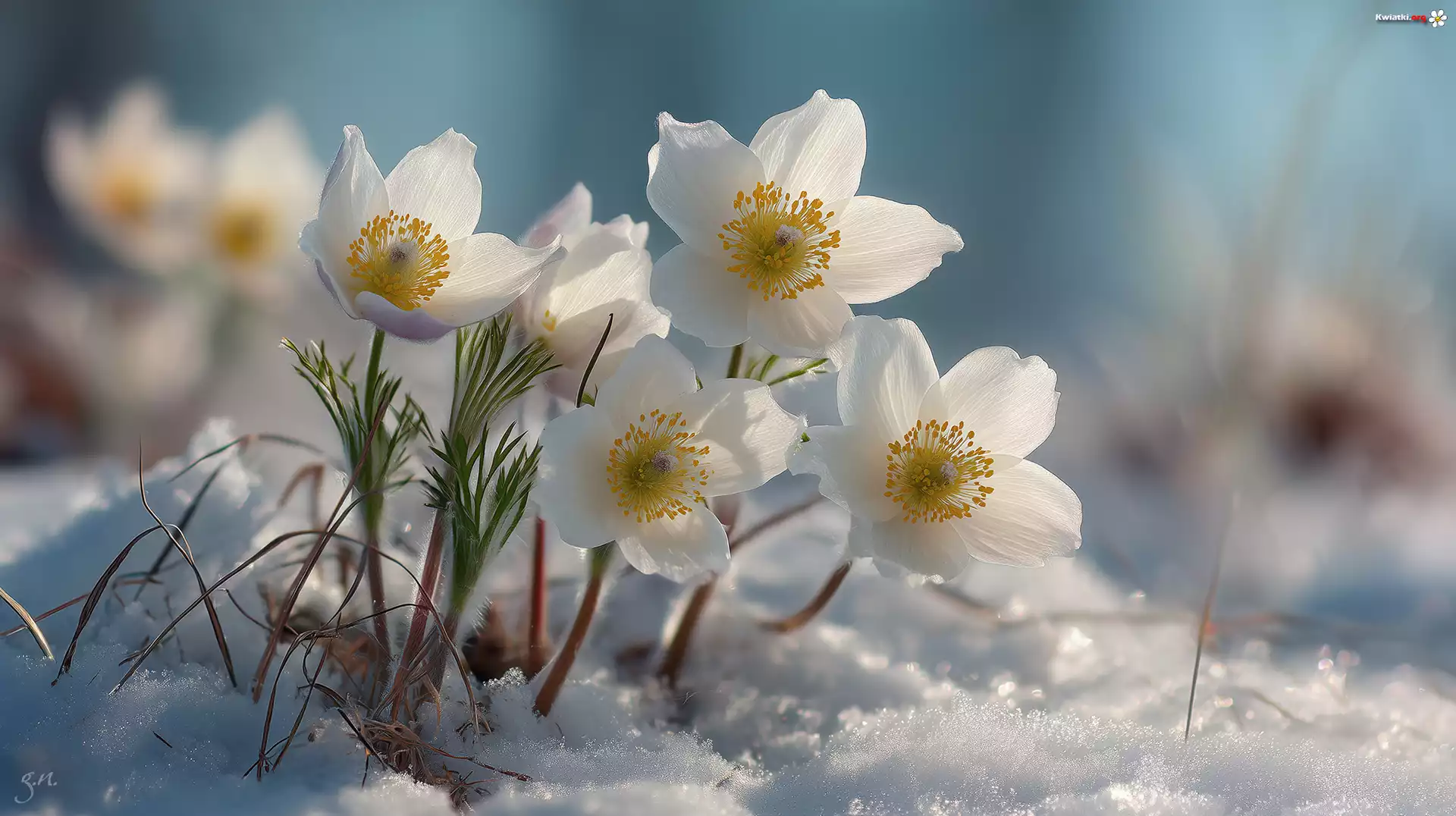 Kwiat Białe, Sasanki, Śnieg, Grafika AI