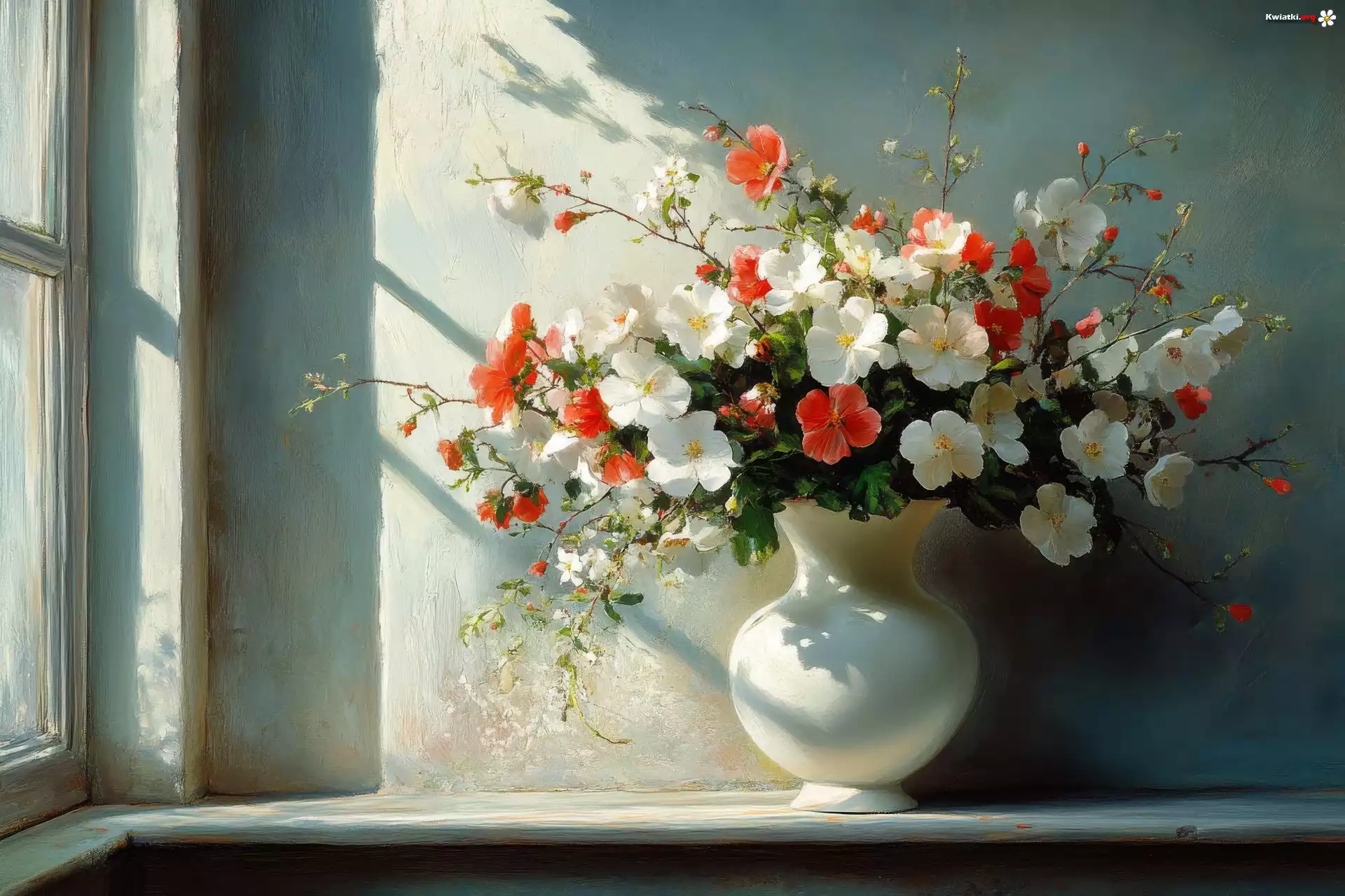 Kwiaty, Bukiet, Wazon, Ściana, Okno, Grafika - Zdjęcia
