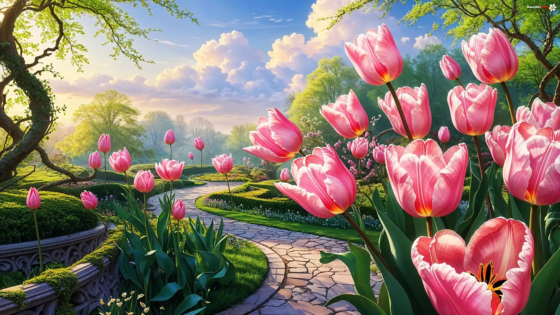 Kwiat Tulipany, Kwiaty, Wiosna, Ścieżka, Park, Grafika
