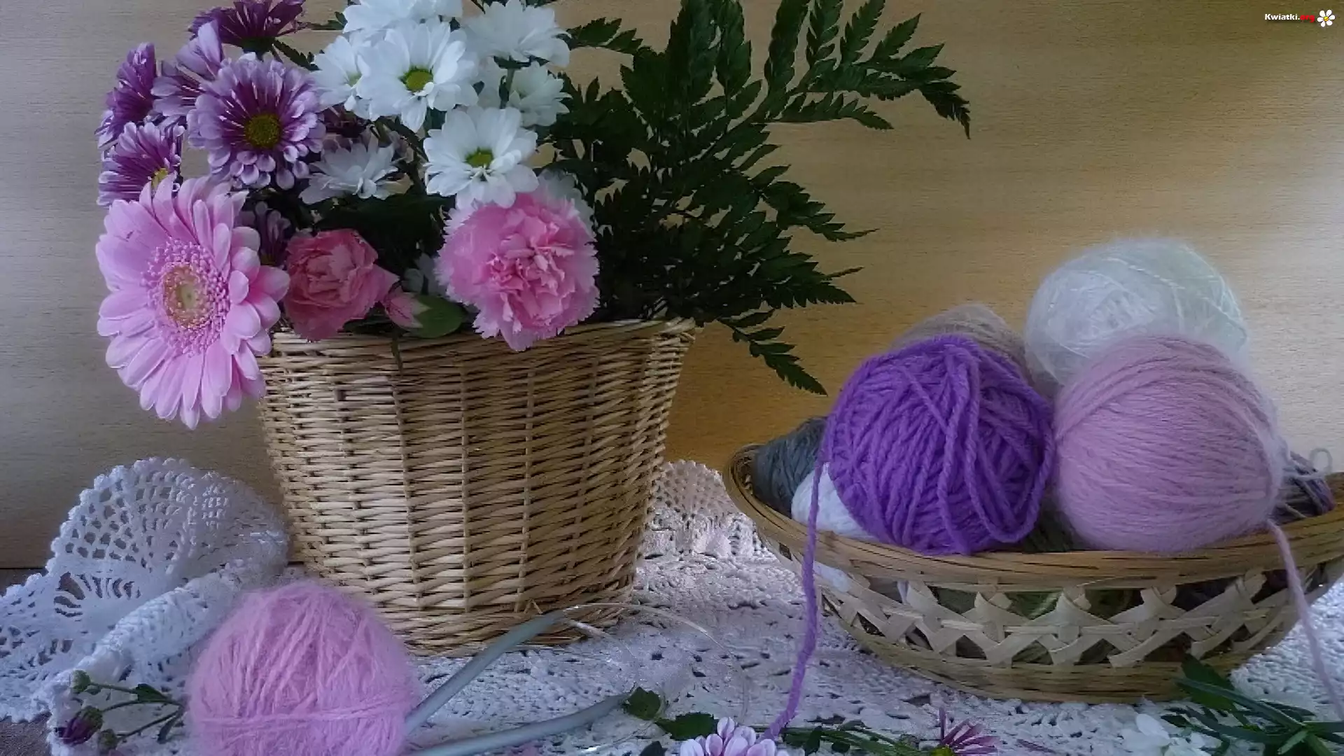 Kwiat Kompozycja, Kwiaty, Goździki, Gerbery, Kłębki, Włóczki, Koszyk, Koszyczek, Serwetki