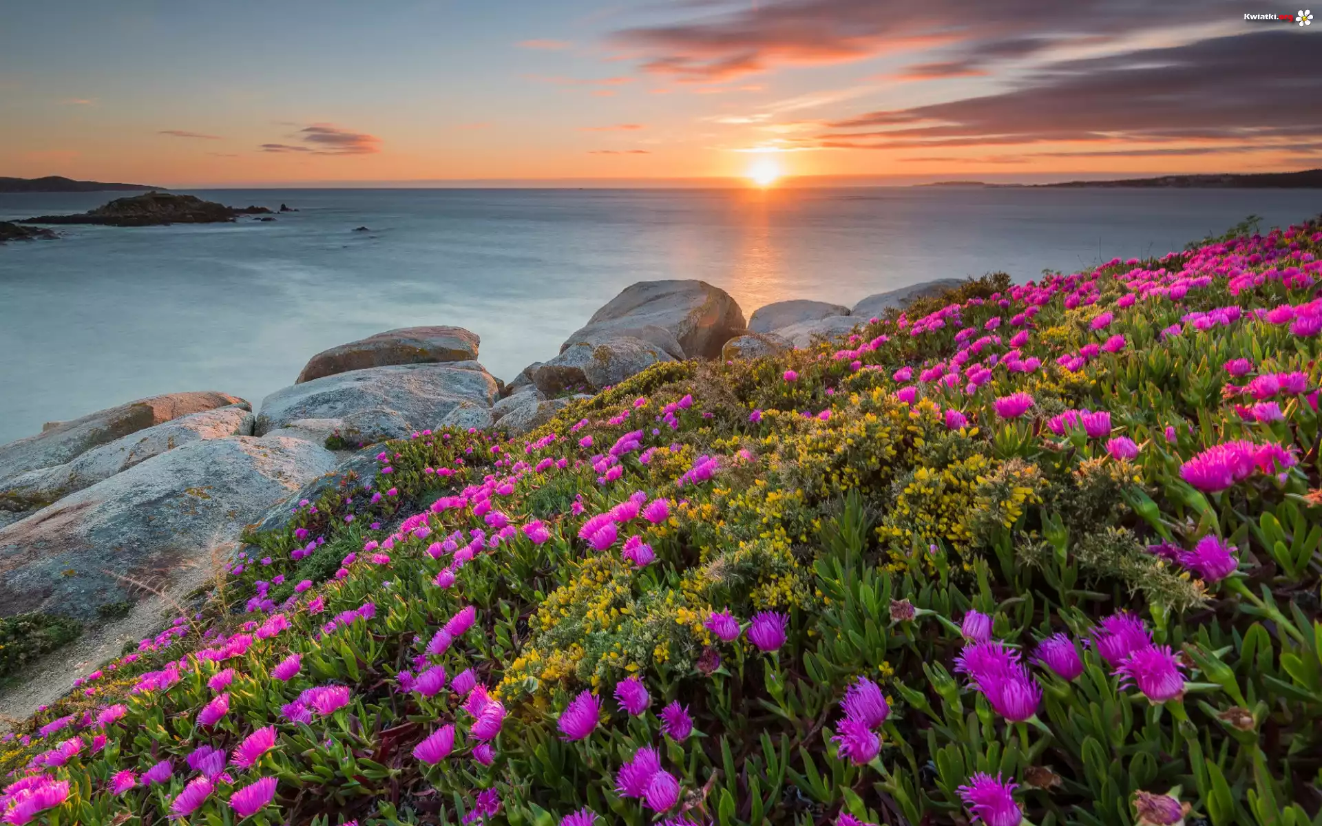 Wybrzeże, Morze, Kwiaty, Skały, Niebo, Zachód słońca - Zdjęcia