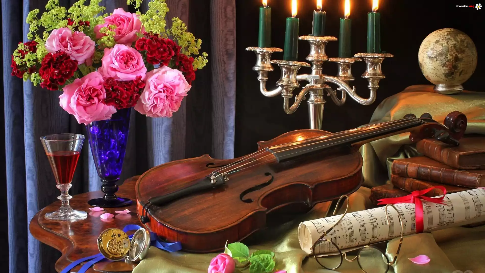 Kwiat Skrzypce, Bukiet, Kwiaty, Róże, Świecznik, Nuty