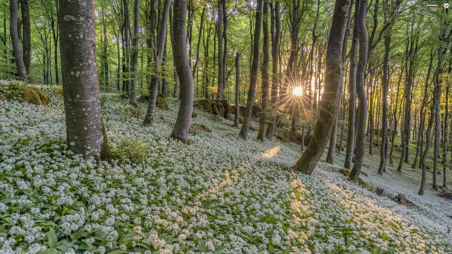 Las, Drzewa, Białe, Kwiaty, Czosnek niedźwiedzi, Promienie słońca - Zdjęcia