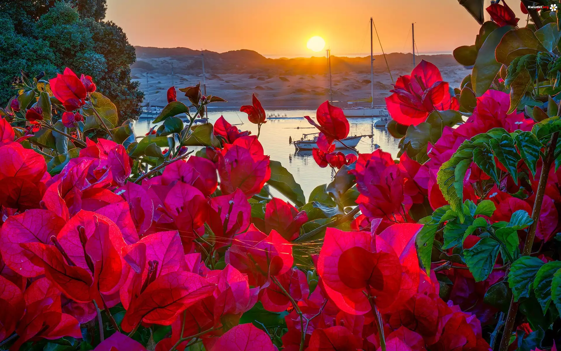 Kwiat Morze, Statek, Promienie słońca, Kwiaty, Bugenwilla