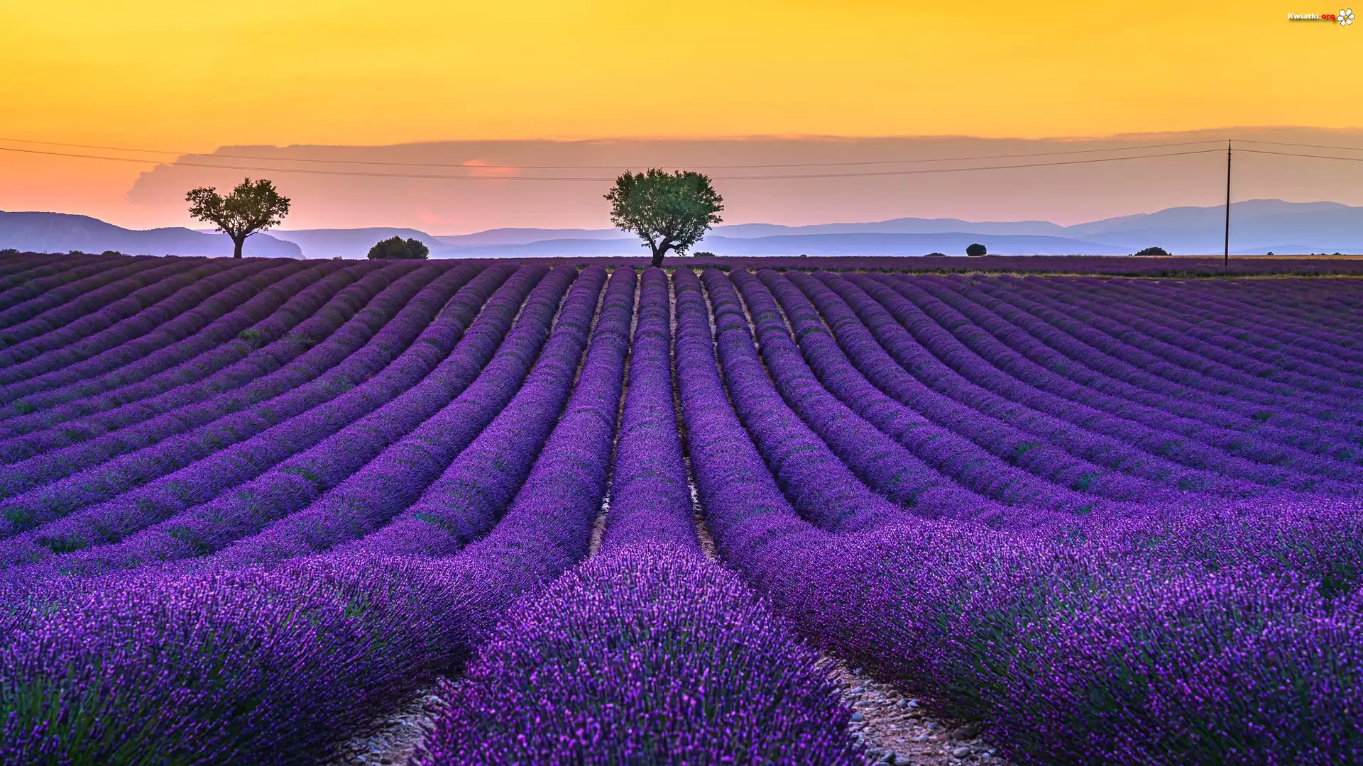 Kwiat Wschód słońca, Pole, Lawenda, Drzewa, Valensole, Prowansja, Francja