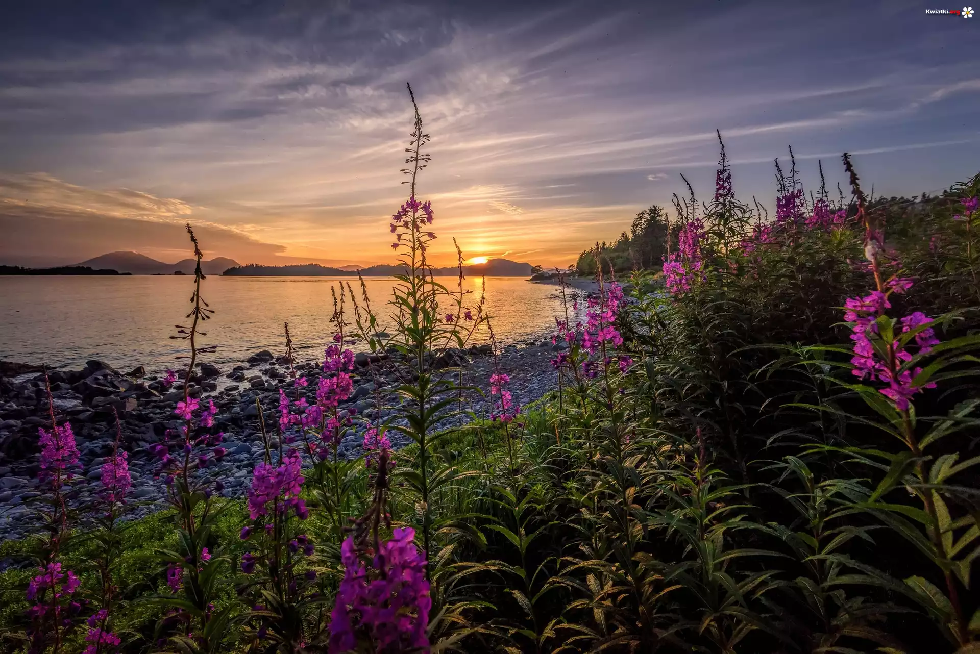 Kwiaty, Wierzbówka kiprzyca, Rośliny, Kamienie, Jezioro, Niebo, Chmury, Zachód słońca - Zdjęcia