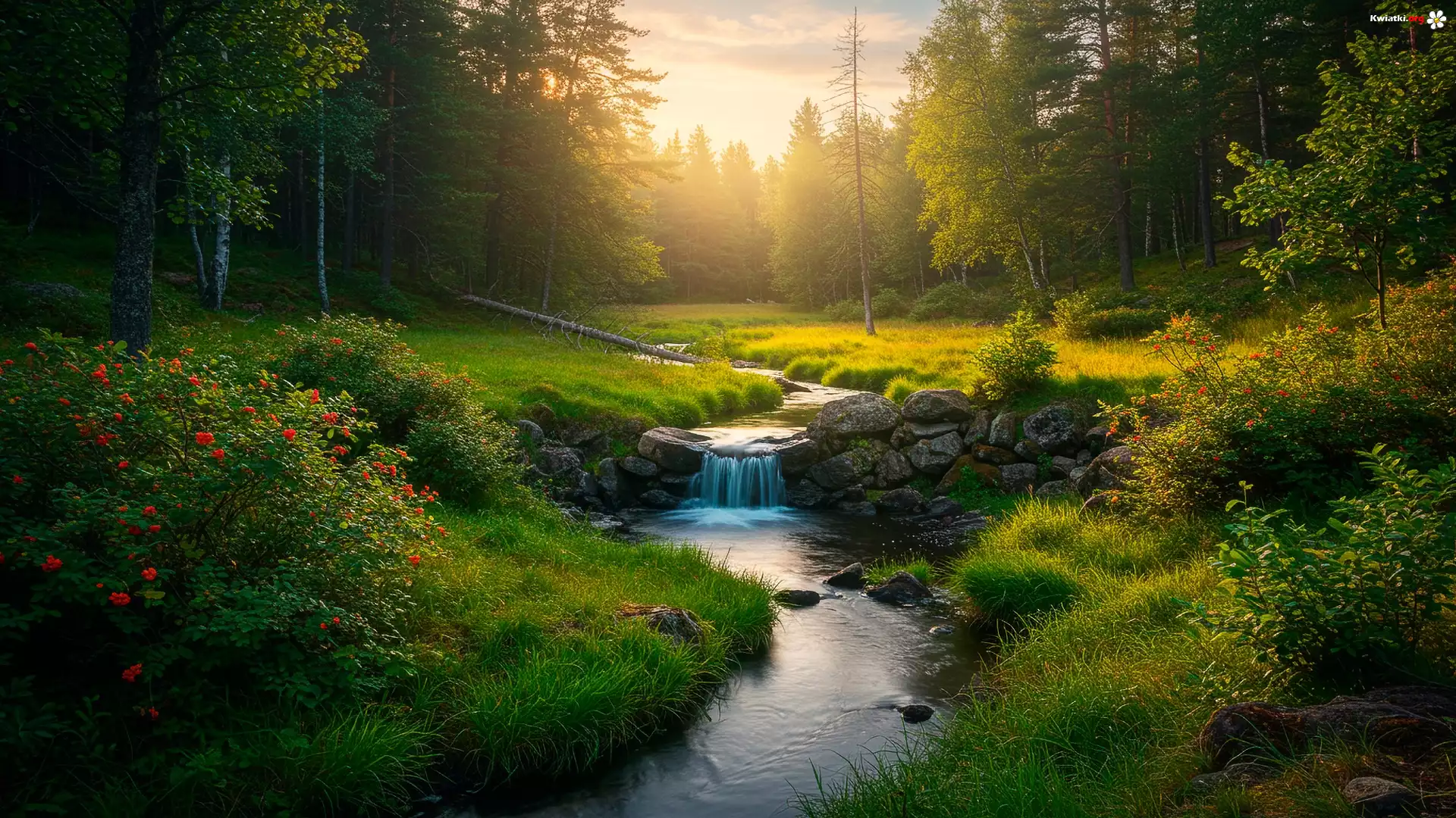 Kwiat Las, Strumień, Krzewy, Róże, Zachód słońca, Zachód Słońca
