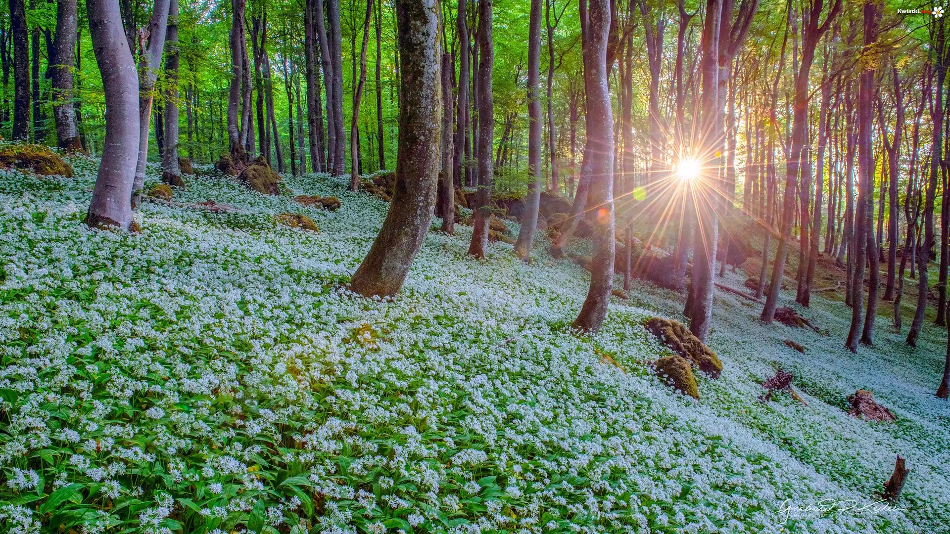 Las, Drzewa, Kwiaty, Biały, Czosnek niedźwiedzi, Promienie słońca - Zdjęcia