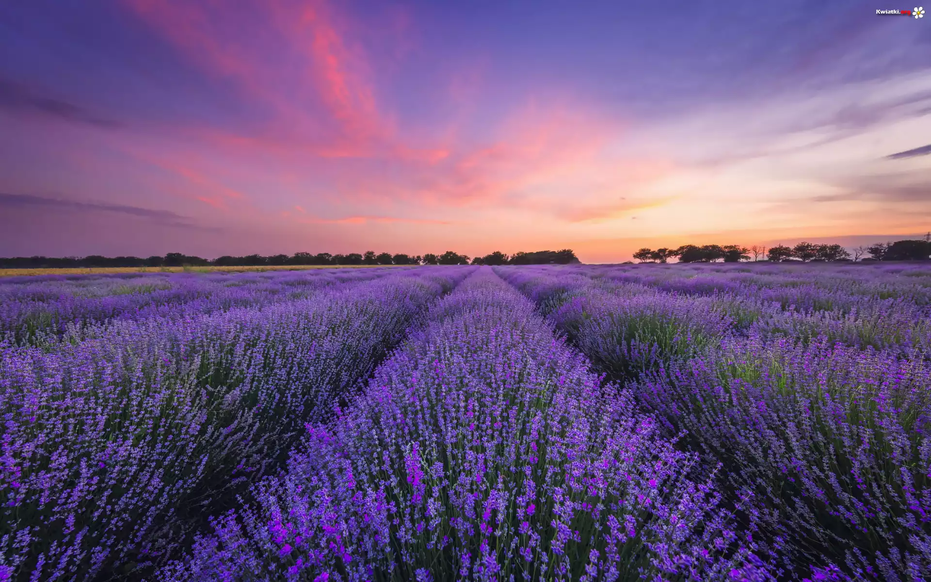 Pole, Kwiaty, Lawenda, Drzewa, Niebo, Poranek, Wschód słońca - Zdjęcia