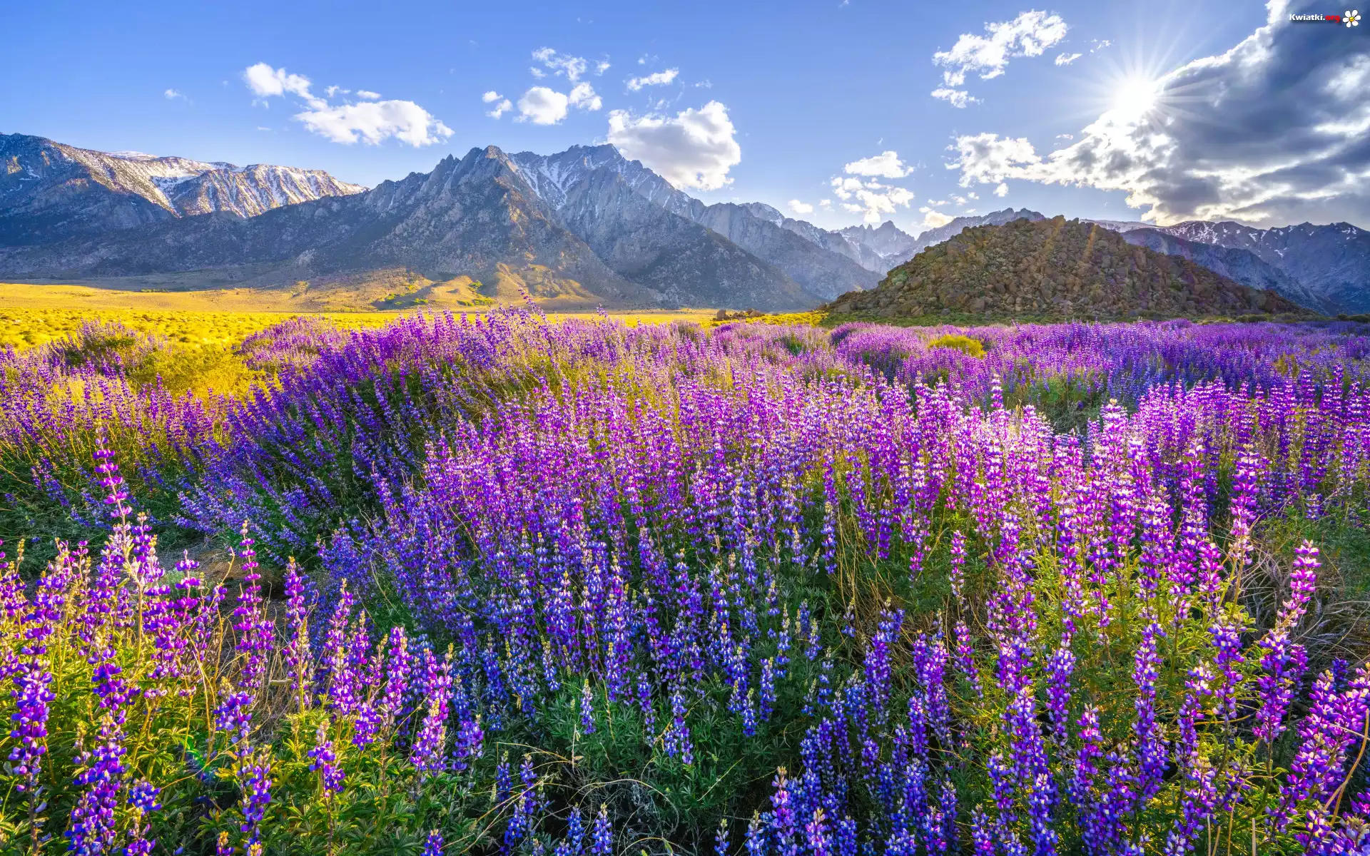 Góry, Kwiaty, Łubin, Polana, Niebo, Lato, Promienie słońca - Zdjęcia