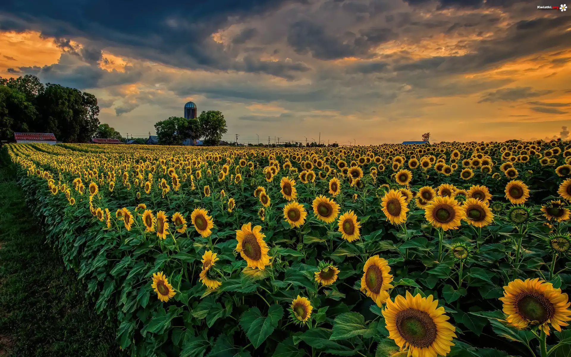 Kwiat Pole, Kwiaty, Słoneczniki, Lato, Drzewa, Chmury, Zachód słońca