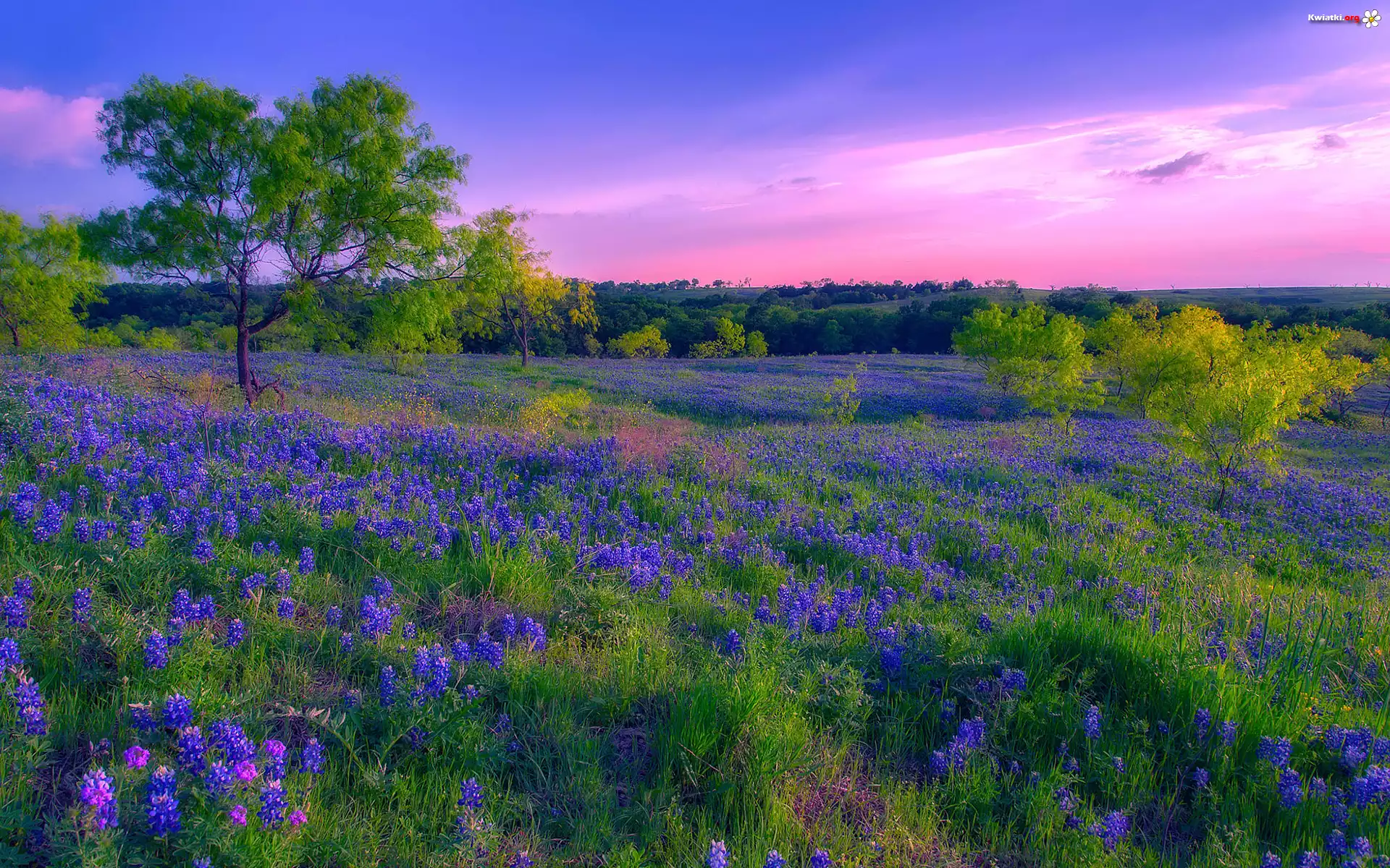 Łąka, Kwiaty, Niebieskie, Łubiny, Lupinus texensis, Drzewa, Zachód słońca - Zdjęcia
